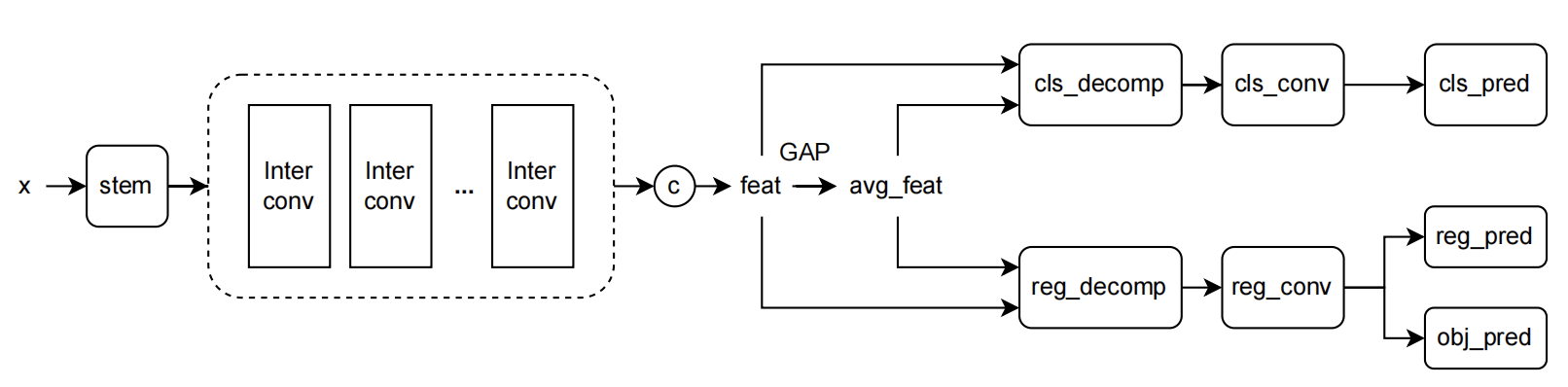 此外,我们利用RepVGGBlock分别优化inter_conv,cls_conv/reg_conv层。实验结果表明用RepVGGBlock实现inter_conv层会带来性能上的下降,而RepVGGBlock实现的cls_conv/reg_conv层与原始卷积层在stack较大时效果相当,在stack比较小时,RepVGGBlock能起到优化作用。
