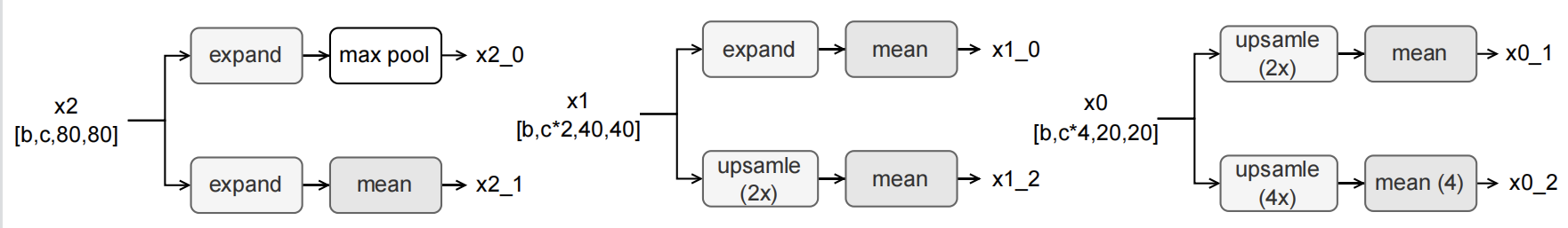 参考YOLO5[8]中的Fcous层的设计,PAI-EasyCV利用切片操作进行特征通道的增加和特征图的缩小。同时,利用求平均操作进行通道的压缩,基于这种实现的ASFF,我们简单区分为ASFF-Sim。我们进行特征图统一的核心操作(通道扩展和通道压缩)如下: