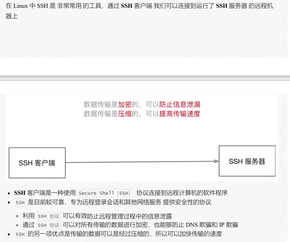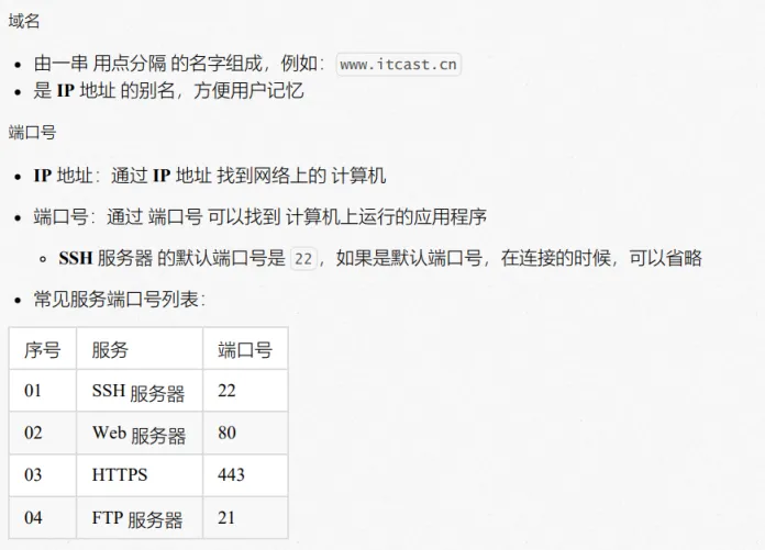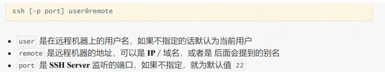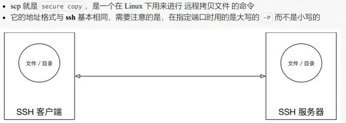 # 把本地当前目录下的 01.py 文件 复制到 远程 家目录下的 Desktop/01.py # 注意:`:` 后面的路径如果不是绝对路径,则以用户的家目录作为参照路径 scp -P port 01.py user@remote:Desktop/01.py 提示: 使用 exit 退出当前用户的登录 注意: ssh 这个终端命令只能在 Linux 或者 UNIX 系统下使用 如果在 Windows 系统中,可以安装 PuTTY 或者 XShell 客户端软件即可 提示: 在工作中,SSH 服务器的端口号很有可能不是 22,如果遇到这种情况就需要使 用 -p 选项,指定正确的端口号,否则无法正常连接到服务器 建议从官方网站下载正式的安装程序 # 把远程 家目录下的 Desktop/01.py 文件 复制到 本地当前目录下的 01.py scp -P port user@remote:Desktop/01.py 01.py # 加上 -r 选项可以传送文件夹 # 把当前目录下的 demo 文件夹 复制到 远程 家目录下的 Desktop scp -r demo user@remote:Desktop # 把远程 家目录下的 Desktop 复制到 当前目录下的 demo 文件夹 scp -r user@remote:Desktop demo