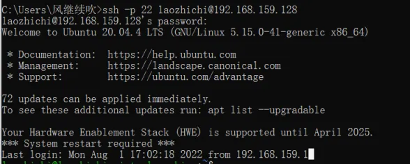 然后在windows的cmd命令行当中,输入ssh -p 20 【ubuntu用户名】@【ubuntu的IP地址】