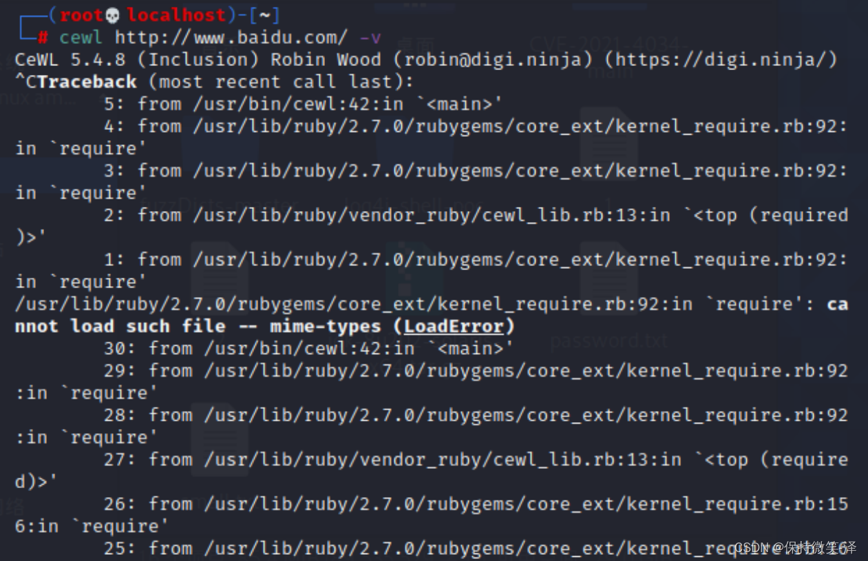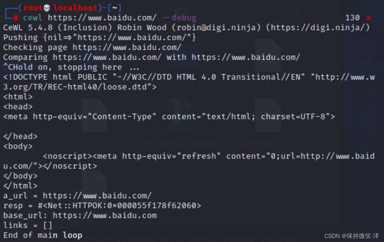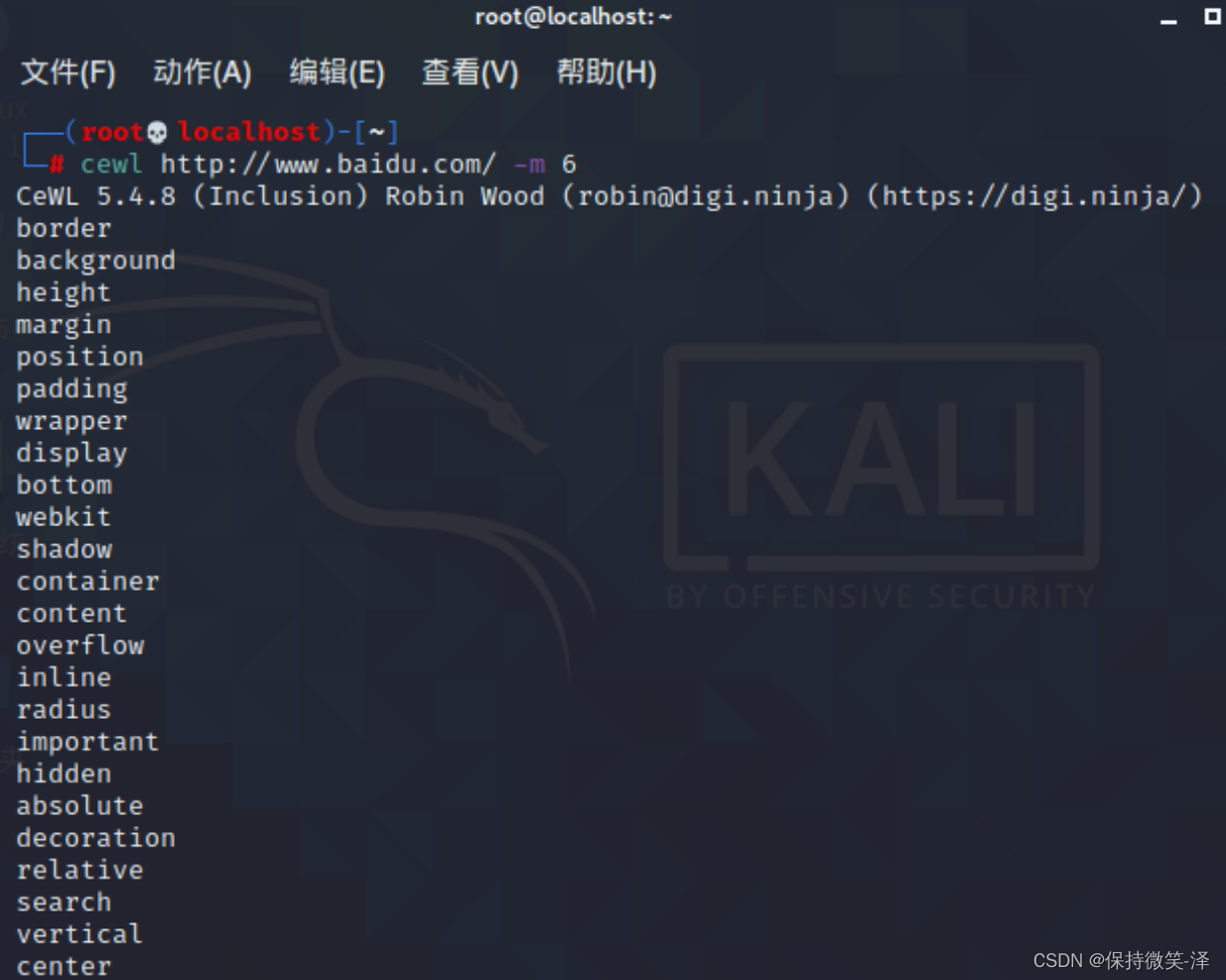 cewl [选项] ... URL --help,-h:显示帮助 --keep,-k:保留下载的文件 --depth x,-d x:深度到蜘蛛,默认2 --min_word_length,-m:最小字长,默认为3 --offsite,-o:让蜘蛛访问其他网站 --write,-w file:将输出写入文件 --ua,-u user-agent:用户代理发送 --no-words,-n:不输出单词表 --meta, -a 包含元数据 --meta_file file:元数据的输出文件 --email,-e包括电子邮件地址 --email_file file:电子邮件地址的输出文件 --meta-temp-dir directory:exiftool在解析文件时使用的临时目录,默认为/ tmp --count,-c:显示找到的每个单词的计数