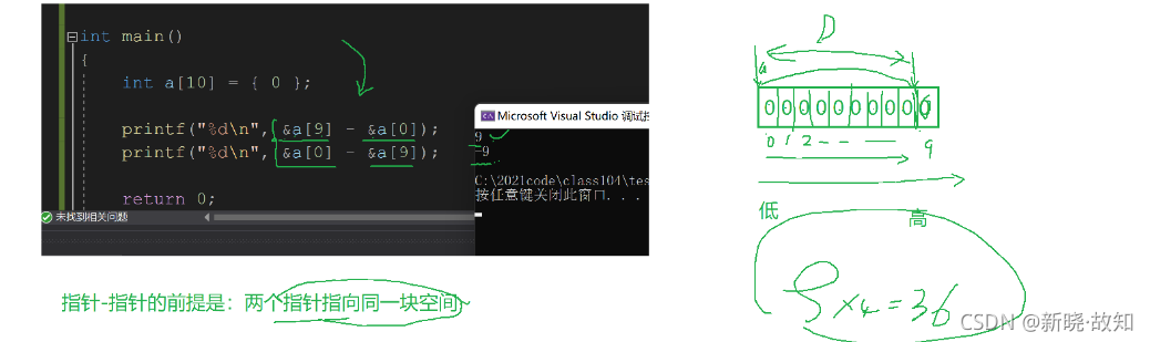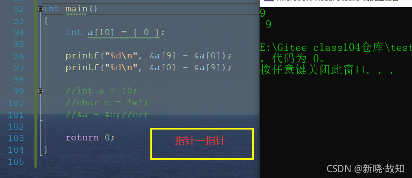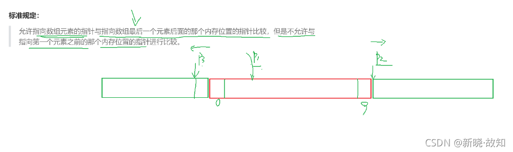 标准规定: 允许指向数组元素的指针与指向数组最后一个元素后面的那个内存位置的指针比较,但是不允许与 指向第一个元素之前的那个内存位置的指针进行比较。