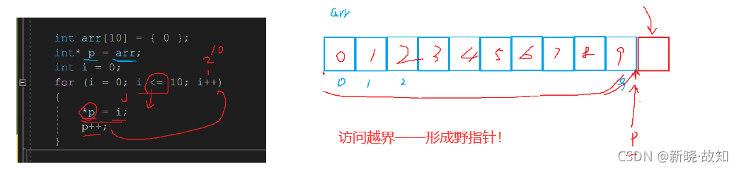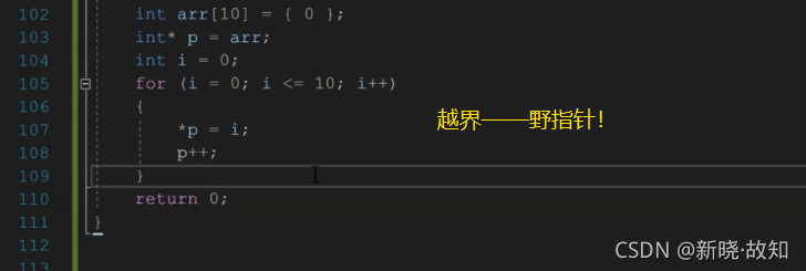 #include <stdio.h> int main() { int arr[10] = {0}; int *p = arr; int i = 0; for(i=0; i<=11; i++) { //当指针指向的范围超出数组arr的范围时,p就是野指针 *(p++) = i; } return 0; }