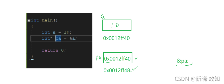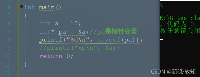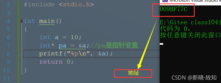 #include <stdio.h> int main() { int a = 10; int* pa = &a; pa是指针变量 printf("%p\n", &a); return 0; }