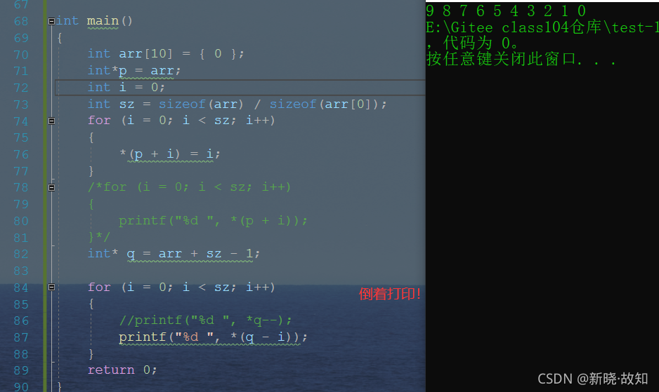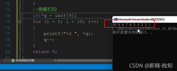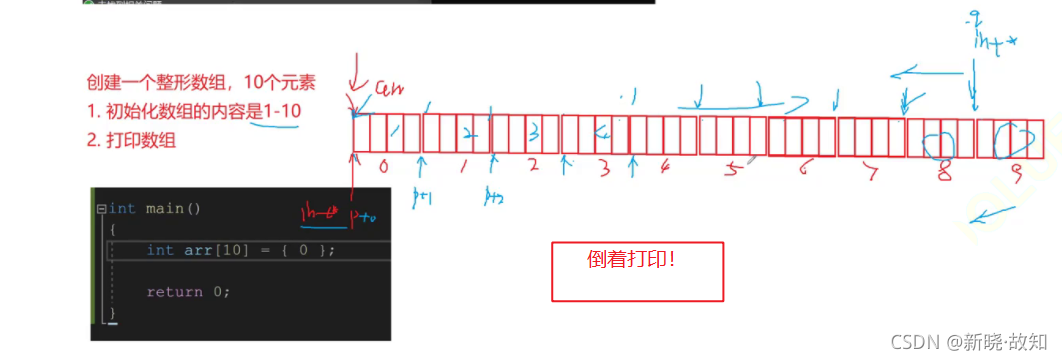 int main() { int arr[10] = { 0 }; int* p = arr; int i = 0; for (i = 0; i < 10; i++) { *(p + i) = i+1; } 倒着打印 int*q = &arr[9]; for (i = 0; i < 10; i++) { printf("%d ", *q); q--; } return 0; }