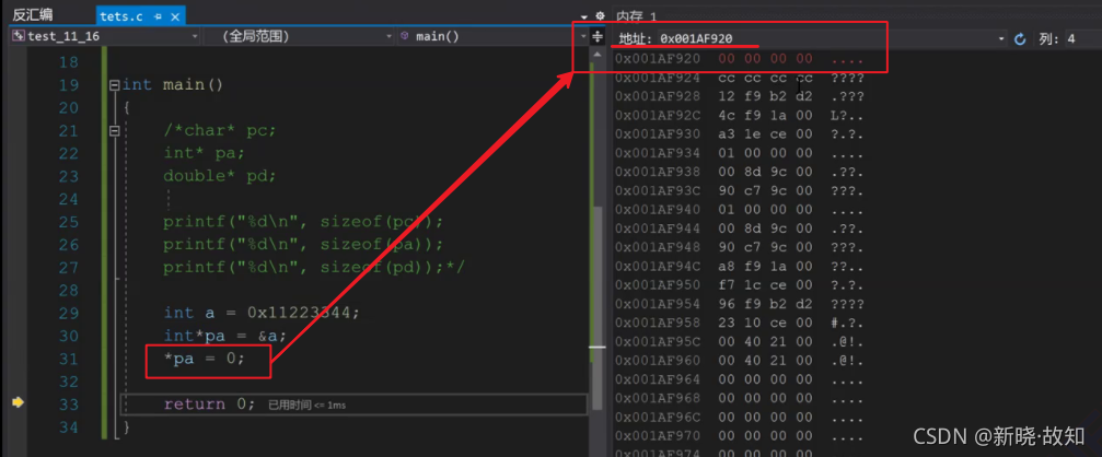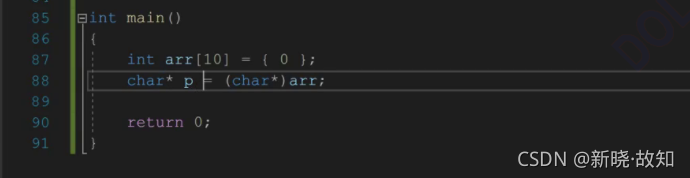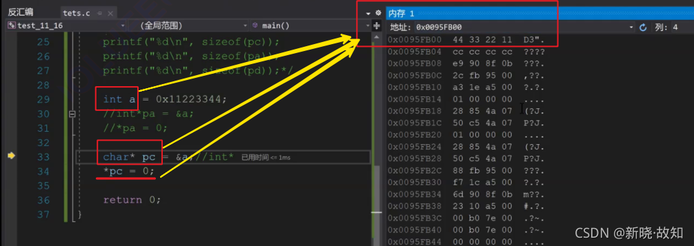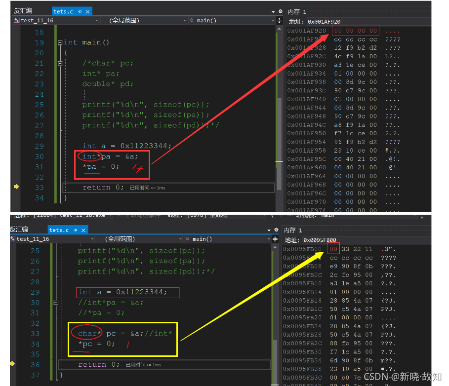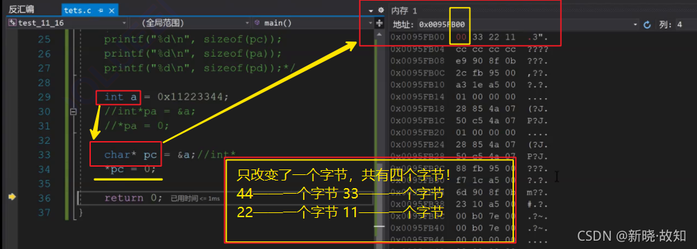 //演示实例 #include <stdio.h> int main() { int n = 0x11223344; char *pc = (char *)&n; int *pi = &n; *pc = 0; //重点在调试的过程中观察内存的变化。 *pi = 0; //重点在调试的过程中观察内存的变化。 return 0; }