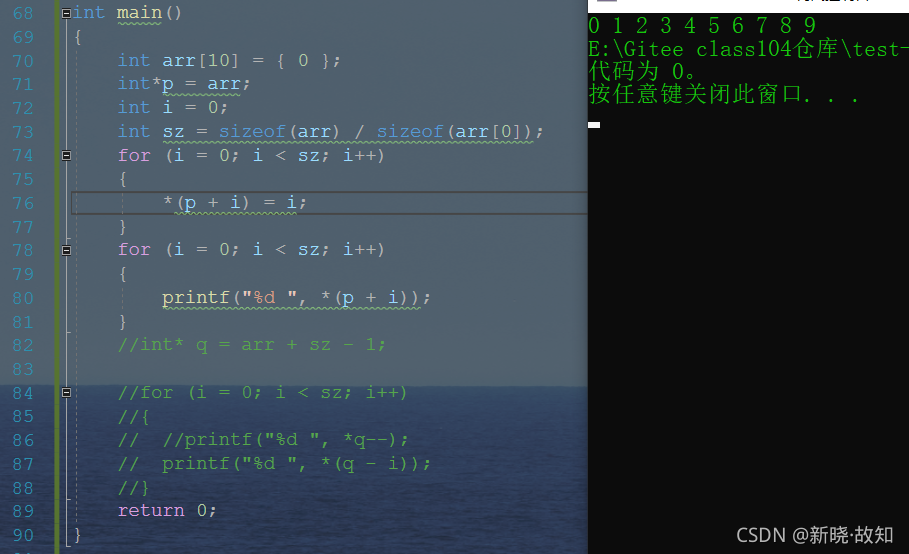 int main() { int arr[10] = { 0 }; int*p = arr; int i = 0; int sz = sizeof(arr) / sizeof(arr[0]); for (i = 0; i < sz; i++) { *(p + i) = i; } for (i = 0; i < sz; i++) { printf("%d ", *(p + i)); } //int* q = arr + sz - 1; //for (i = 0; i < sz; i++) //{ // //printf("%d ", *q--); // printf("%d ", *(q - i)); //} return 0; }