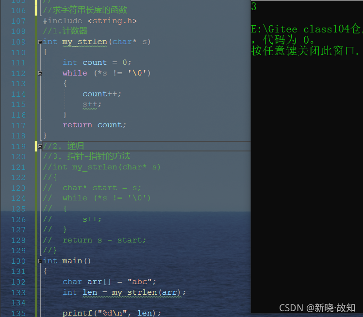 //求字符串长度的函数 #include <string.h> //1.计数器 int my_strlen(char* s) { int count = 0; while (*s != '\0') { count++; s++; } return count; } //2. 递归 //3. 指针-指针的方法 //int my_strlen(char* s) //{ // char* start = s; // while (*s != '\0') // { // s++; // } // return s - start; //} int main() { char arr[] = "abc"; int len = my_strlen(arr); printf("%d\n", len); return 0; }
