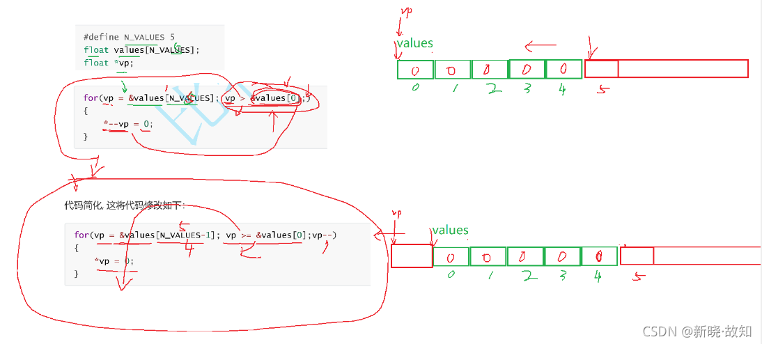 #define N_VALUES 5 float values[N_VALUES]; float *vp; //指针+-整数;指针的关系运算 for (vp = &values[0]; vp < &values[N_VALUES];) { *vp++ = 0; }