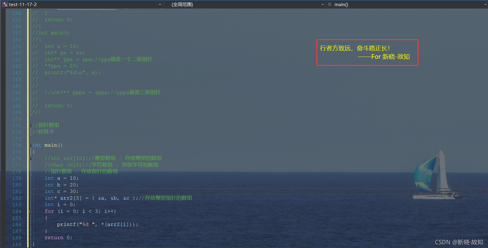 int main() { //int arr[10];//整型数组 - 存放整型的数组 //char ch[5];//字符数组 - 存放字符的数组 //指针数组 - 存放指针的数组 int a = 10; int b = 20; int c = 30; int* arr2[5] = { &a, &b, &c };//存放整型指针的数组 int i = 0; for (i = 0; i < 3; i++) { printf("%d ", *(arr2[i])); } return 0; }