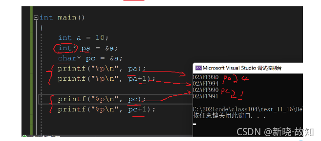 #include <stdio.h> //演示实例 int main() { int n = 10; char *pc = (char*)&n; int *pi = &n; printf("%p\n", &n); printf("%p\n", pc); printf("%p\n", pc+1); printf("%p\n", pi); printf("%p\n", pi+1); return 0; }