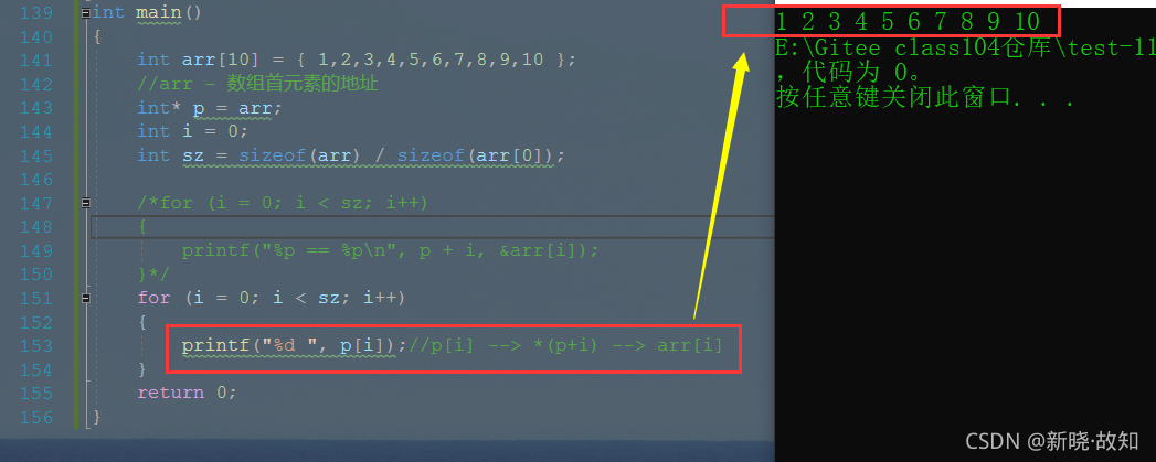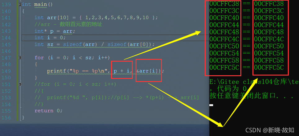 int main() { int arr[10] = { 1,2,3,4,5,6,7,8,9,10 }; //arr - 数组首元素的地址 int* p = arr; int i = 0; int sz = sizeof(arr) / sizeof(arr[0]); for (i = 0; i < sz; i++) { printf("%p == %p\n", p + i, &arr[i]); } //for (i = 0; i < sz; i++) //{ // printf("%d ", p[i]);//p[i] --> *(p+i) --> arr[i] //} return 0; }