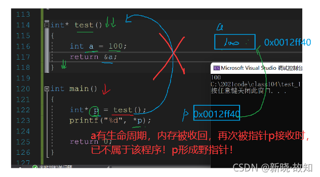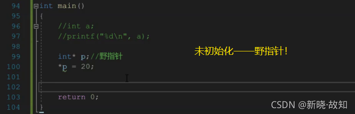 概念: 野指针就是指针指向的位置是不可知的(随机的、不正确的、没有明确限制的)