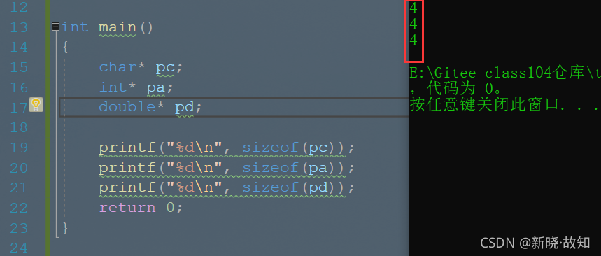 int main() { char* pc; int* pa; double* pd; printf("%d\n", sizeof(pc)); printf("%d\n", sizeof(pa)); printf("%d\n", sizeof(pd)); return 0; }