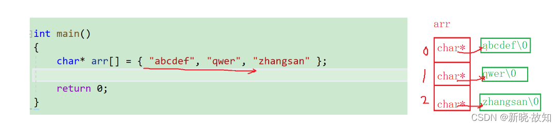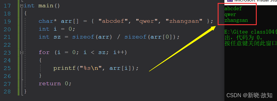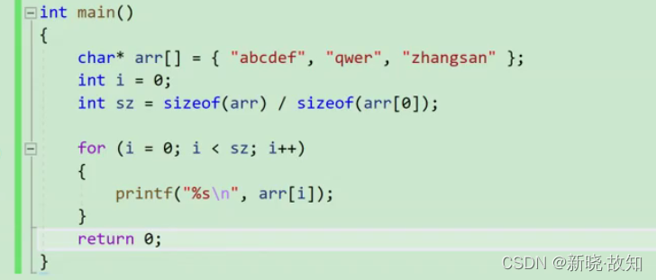 int main() { char* arr[] = { "abcdef", "qwer", "zhangsan" }; int i = 0; int sz = sizeof(arr) / sizeof(arr[0]); for (i = 0; i < sz; i++) { printf("%s\n", arr[i]); } return 0; }
