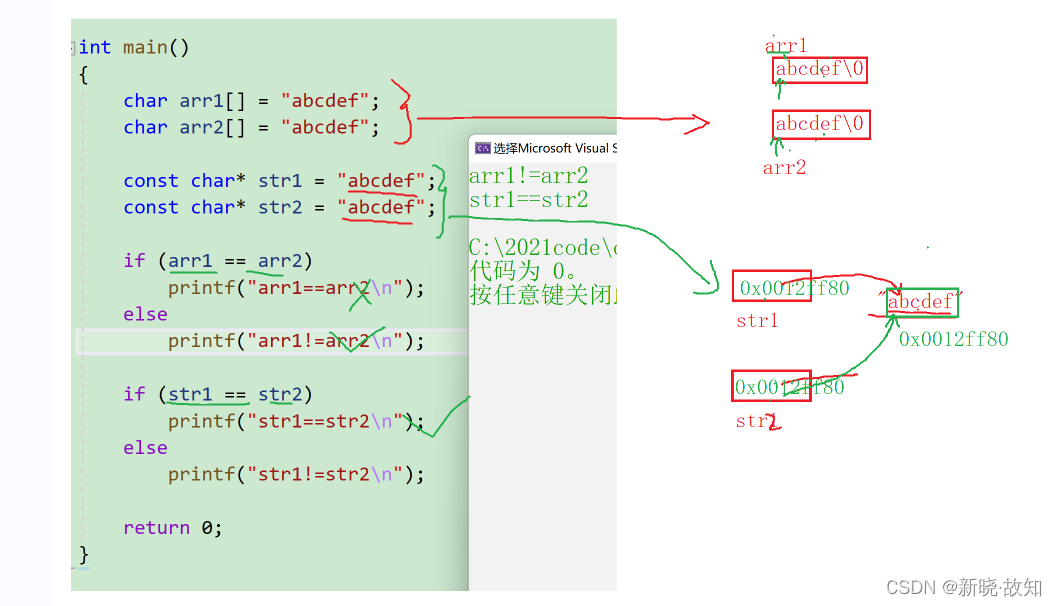 int main() { char arr1[] = "abcdef"; char arr2[] = "abcdef"; const char* str1 = "abcdef"; const char* str2 = "abcdef"; if (arr1 == arr2) printf("arr1==arr2\n"); else printf("arr1!=arr2\n"); if (str1 == str2) printf("str1==str2\n"); else printf("str1!=str2\n"); return 0; }