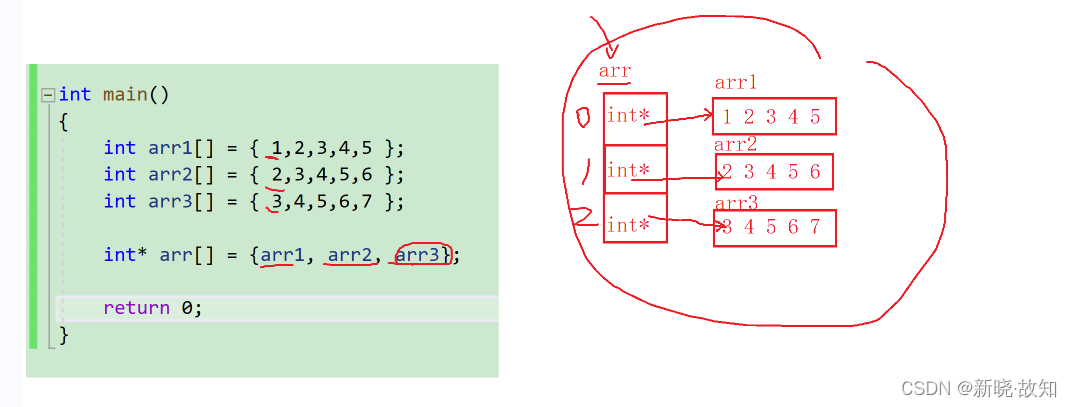 int main() { int arr1[] = { 1,2,3,4,5 }; int arr2[] = { 2,3,4,5,6 }; int arr3[] = { 3,4,5,6,7 }; int* arr[] = {arr1, arr2, arr3}; int i = 0; for (i = 0; i < 3; i++) { int j = 0; for (j = 0; j < 5; j++) { printf("%d ", arr[i][j]);//*(*(arr+i)+j) } printf("\n"); } return 0; }