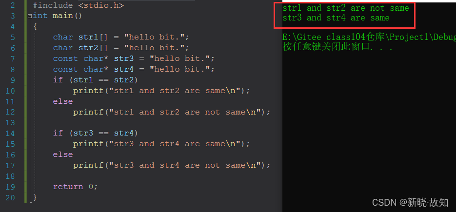#include <stdio.h> int main() { char str1[] = "hello bit."; char str2[] = "hello bit."; const char* str3 = "hello bit."; const char* str4 = "hello bit."; if (str1 == str2) printf("str1 and str2 are same\n"); else printf("str1 and str2 are not same\n"); if (str3 == str4) printf("str3 and str4 are same\n"); else printf("str3 and str4 are not same\n"); return 0; }