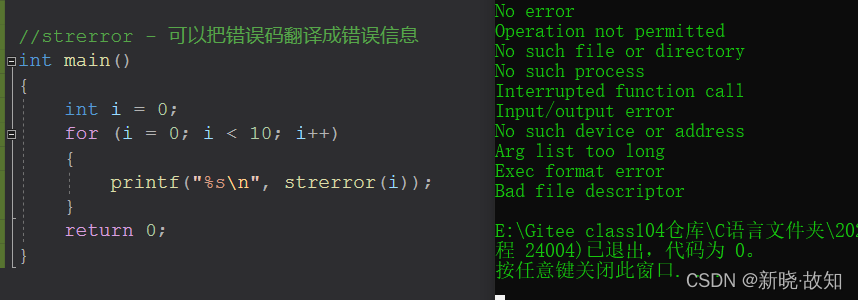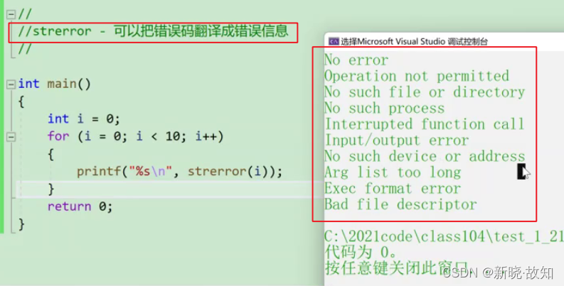 //strerror - 可以把错误码翻译成错误信息 int main() { int i = 0; for (i = 0; i < 10; i++) { printf("%s\n", strerror(i)); } return 0; }