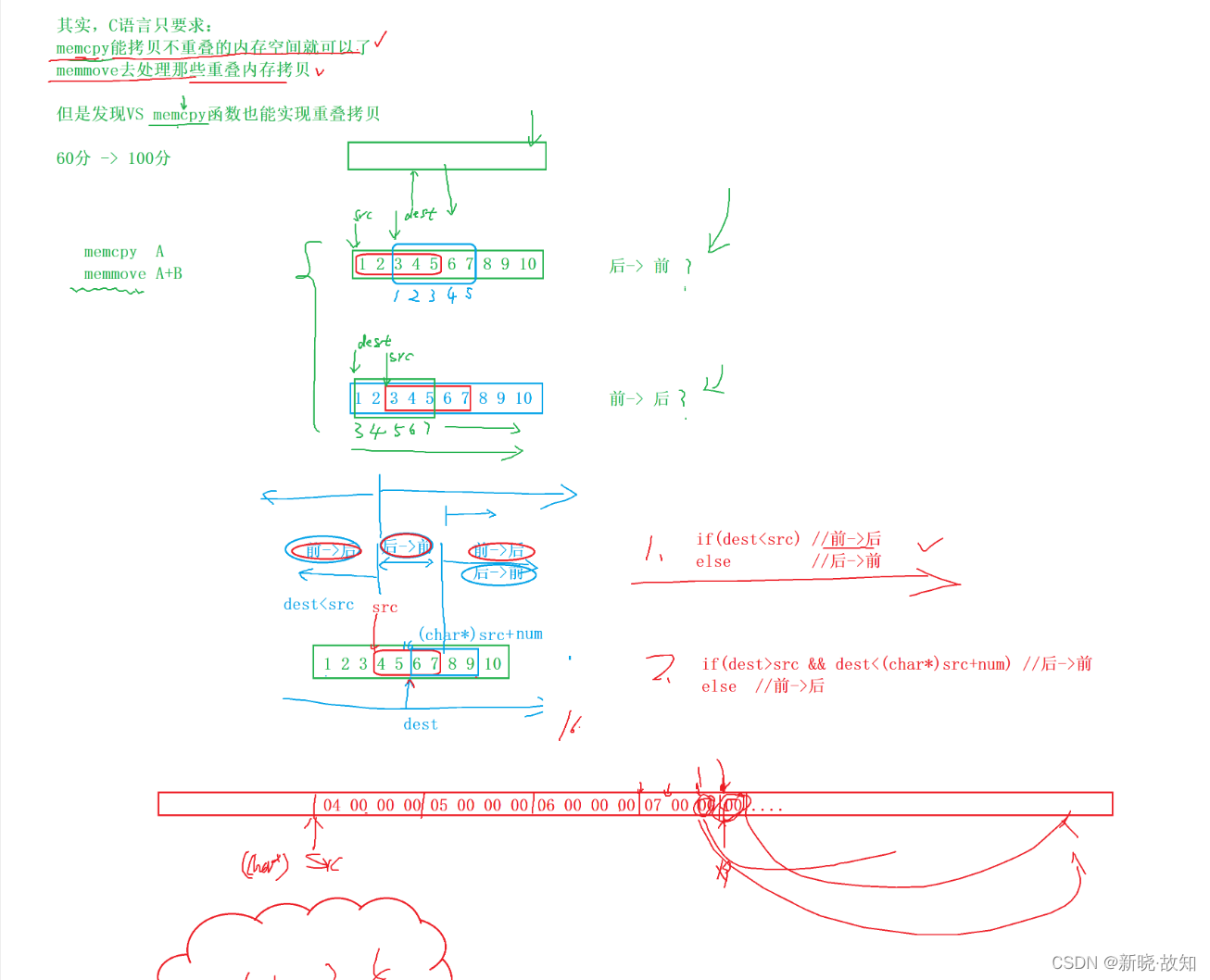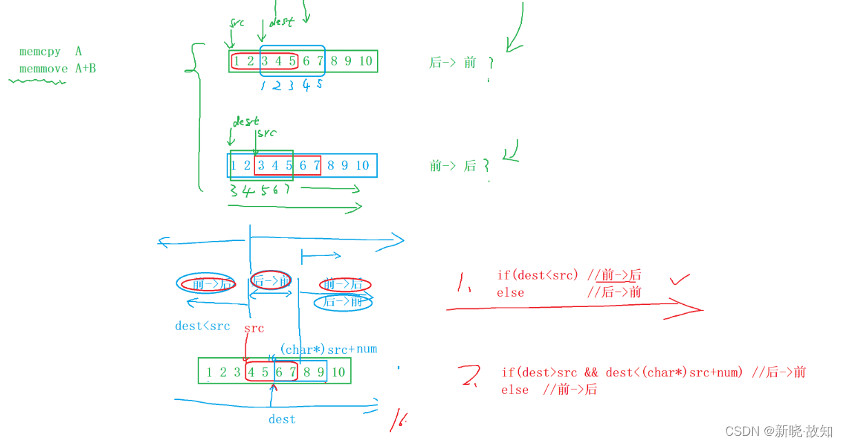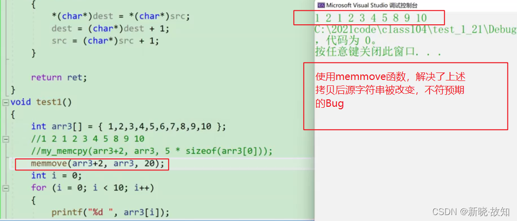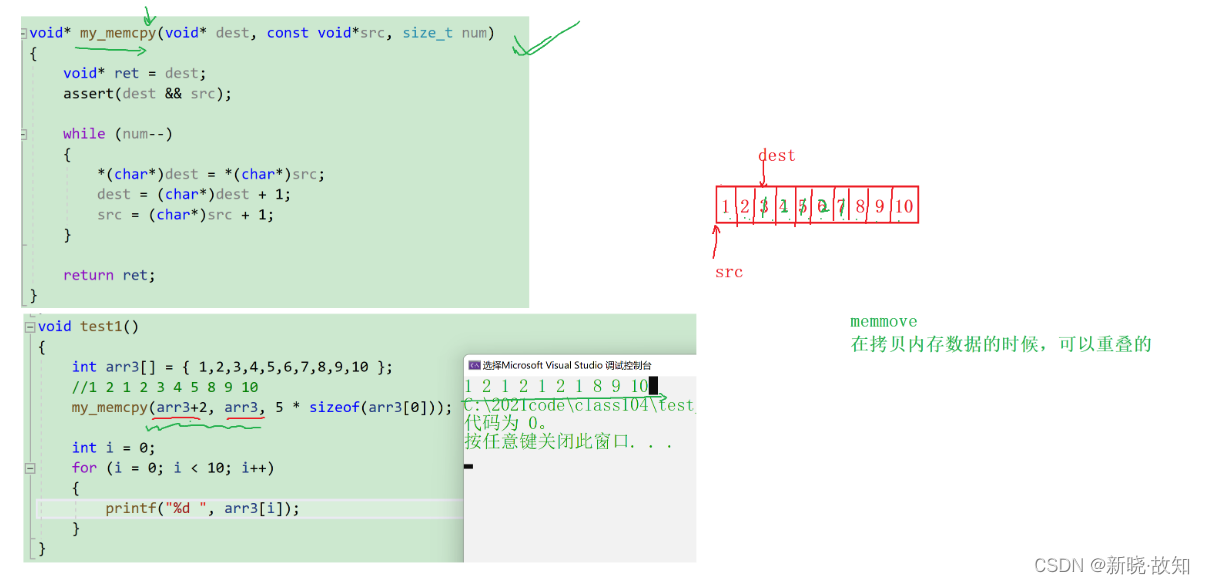 #include <assert.h> void* my_memmove(void* dest, const void* src, size_t num) { void* ret = dest; assert(dest && src); if (dest < src) { //前->后 while (num--) { *(char*)dest = *(char*)src; dest = (char*)dest + 1; src = (char*)src + 1; } } else { //后->前 while (num--) { *((char*)dest+num) = *((char*)src + num); } } return ret; } void test1() { int arr3[] = { 1,2,3,4,5,6,7,8,9,10 }; //1 2 1 2 3 4 5 8 9 10 //my_memcpy(arr3+2, arr3, 5 * sizeof(arr3[0])); my_memmove(arr3, arr3 + 2, 20); int i = 0; for (i = 0; i < 10; i++) { printf("%d ", arr3[i]); } } int main() { test1(); return 0; }