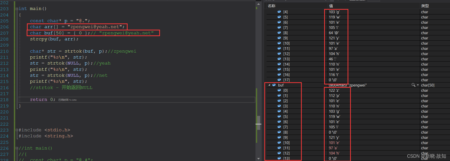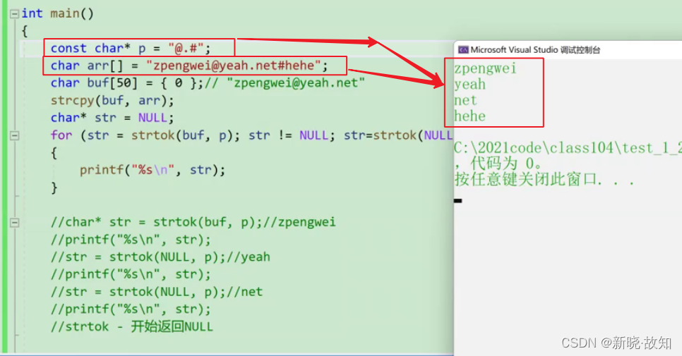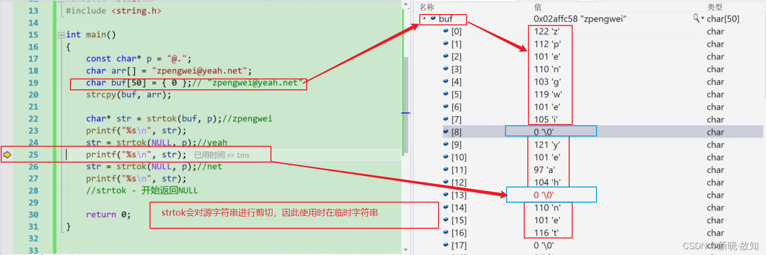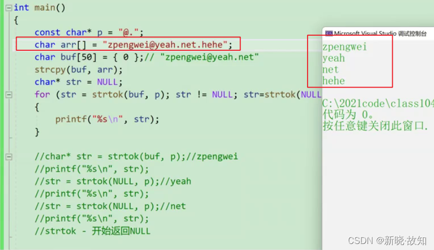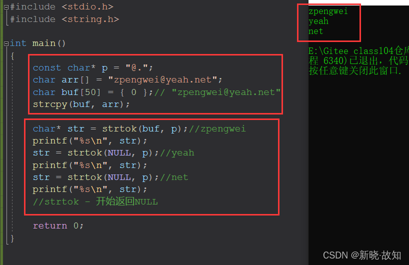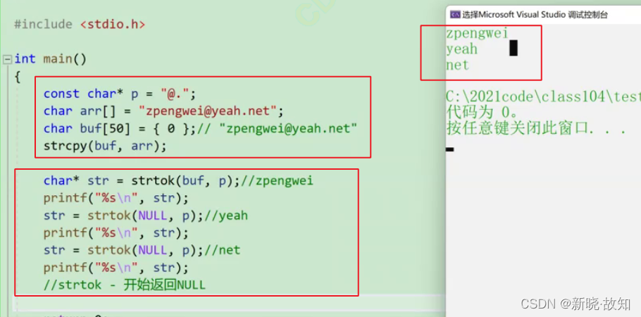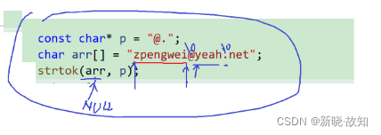 #include <stdio.h> #include <string.h> int main() { const char* p = "@."; char arr[] = "zpengwei@yeah.net"; char buf[50] = { 0 };// "zpengwei@yeah.net" strcpy(buf, arr); char* str = strtok(buf, p);//zpengwei printf("%s\n", str); str = strtok(NULL, p);//yeah printf("%s\n", str); str = strtok(NULL, p);//net printf("%s\n", str); //strtok - 开始返回NULL return 0; }