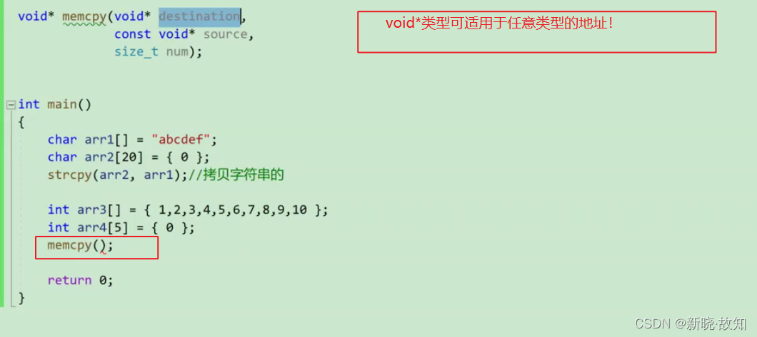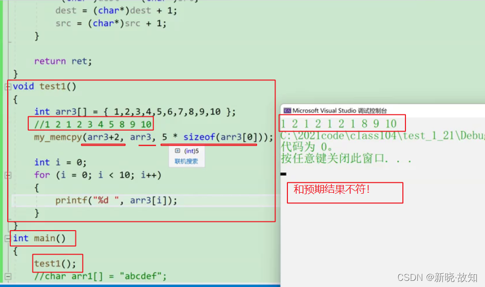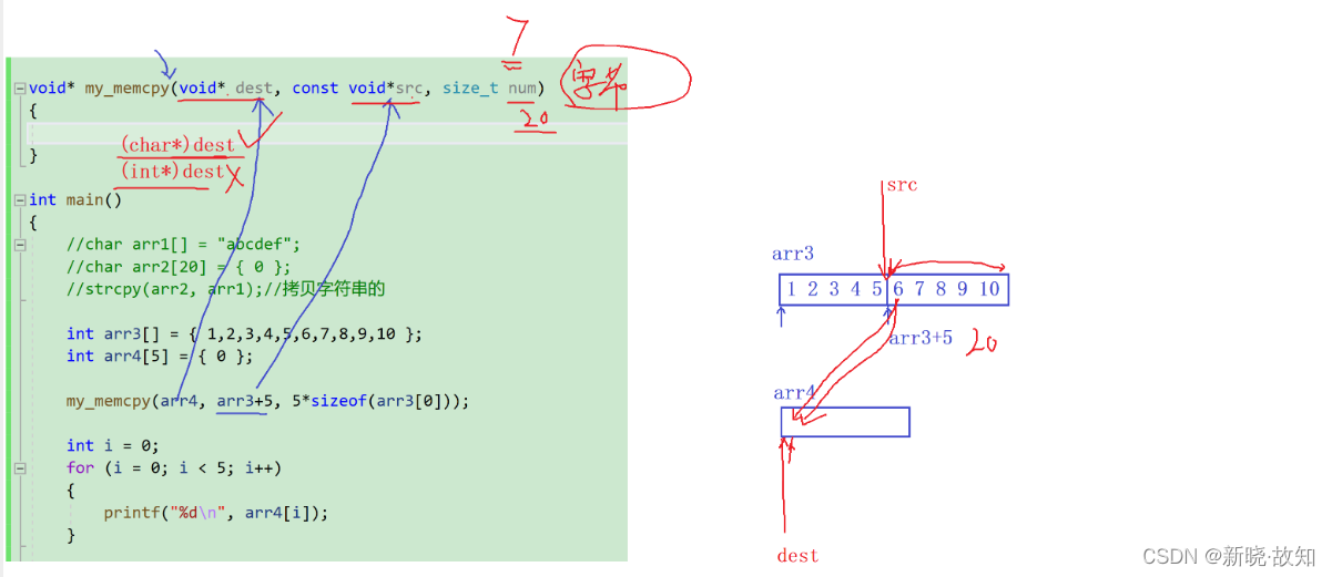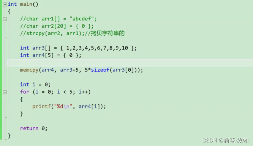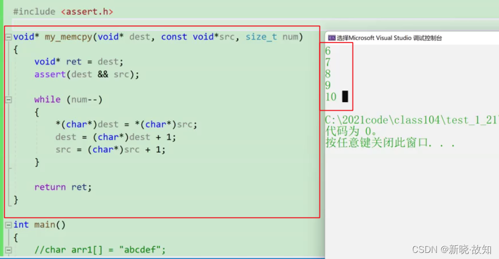 #include <assert.h> void* my_memcpy(void* dest, const void*src, size_t num) { void* ret = dest; assert(dest && src); while (num--) { *(char*)dest = *(char*)src; dest = (char*)dest + 1; src = (char*)src + 1; } return ret; } int main() { char arr1[] = "abcdef"; char arr2[20] = { 0 }; strcpy(arr2, arr1);//拷贝字符串的 int arr3[] = { 1,2,3,4,5,6,7,8,9,10 }; int arr4[5] = { 0 }; my_memcpy(arr4, arr3+5, 5*sizeof(arr3[0])); int i = 0; for (i = 0; i < 5; i++) { printf("%d\n", arr4[i]); } return 0; }