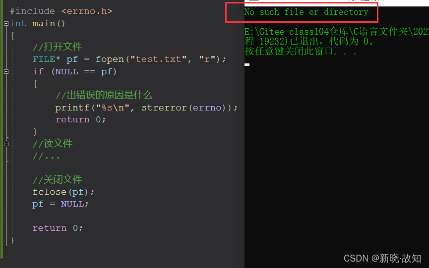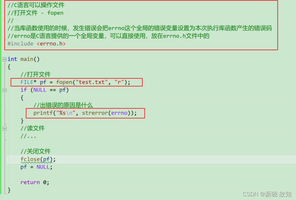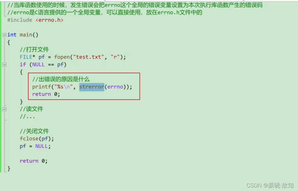 #include <errno.h> int main() { //打开文件 FILE* pf = fopen("test.txt", "r"); if (NULL == pf) { //出错误的原因是什么 printf("%s\n", strerror(errno)); return 0; } //读文件 //... //关闭文件 fclose(pf); pf = NULL; return 0; }