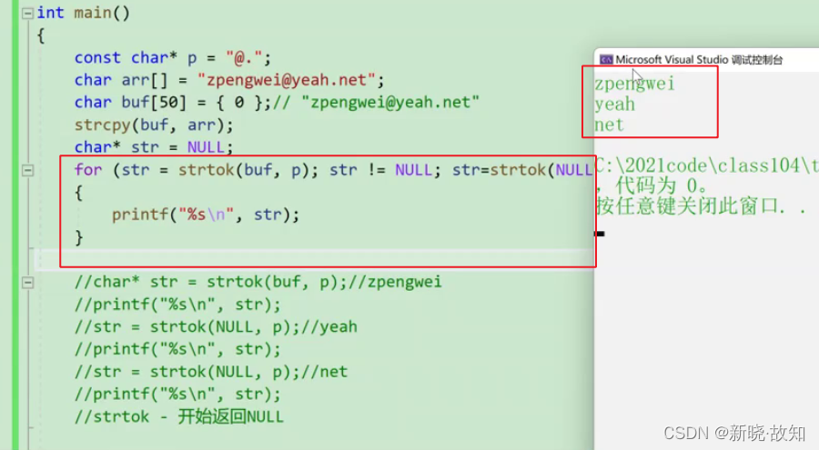 #include <stdio.h> #include <string.h> int main() { const char* p = "@.#"; char arr[] = "zpengwei@yeah.net#hehe"; char buf[50] = { 0 };// "zpengwei@yeah.net" strcpy(buf, arr); char* str = NULL; for (str = strtok(buf, p); str != NULL; str=strtok(NULL, p)) { printf("%s\n", str); } //strtok - 开始返回NULL return 0; }
