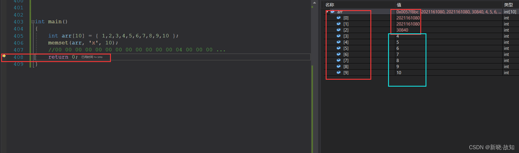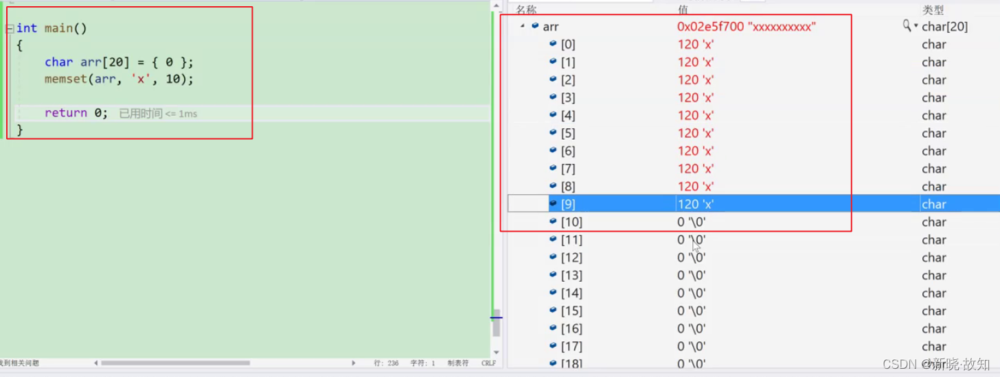 int main() { int arr[10] = { 1,2,3,4,5,6,7,8,9,10 }; memset(arr, 'x', 10); //00 00 00 00 00 00 00 00 00 00 00 00 04 00 00 00 ... return 0; }