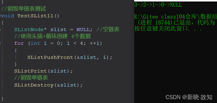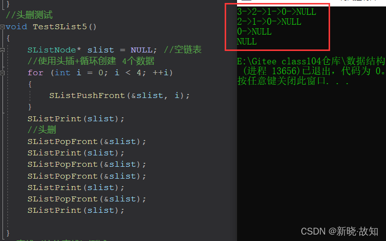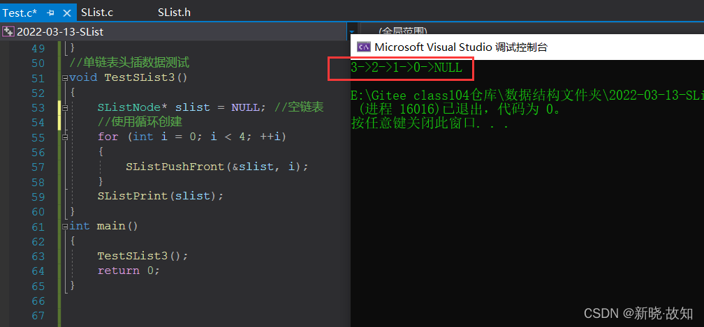 #include "SList.h" //单链表头插数据测试 void TestSList3() { SListNode* slist = NULL; //空链表 //使用循环创建 for (int i = 0; i < 4; ++i) { SListPushFront(&slist, i); } SListPrint(slist); } int main() { TestSList3(); return 0; }