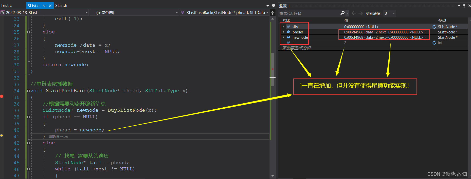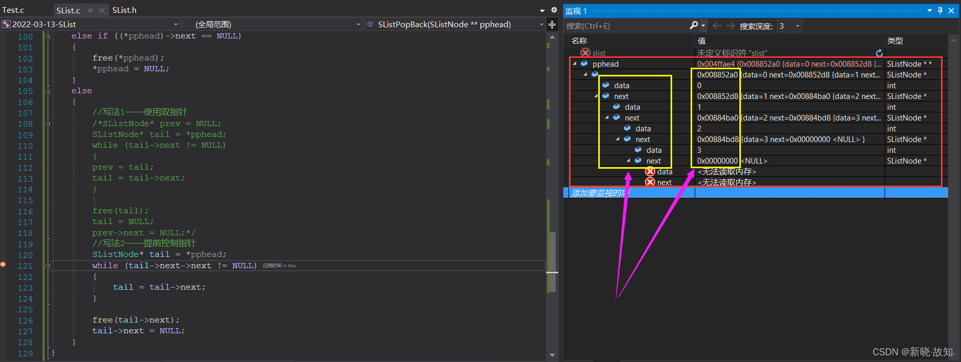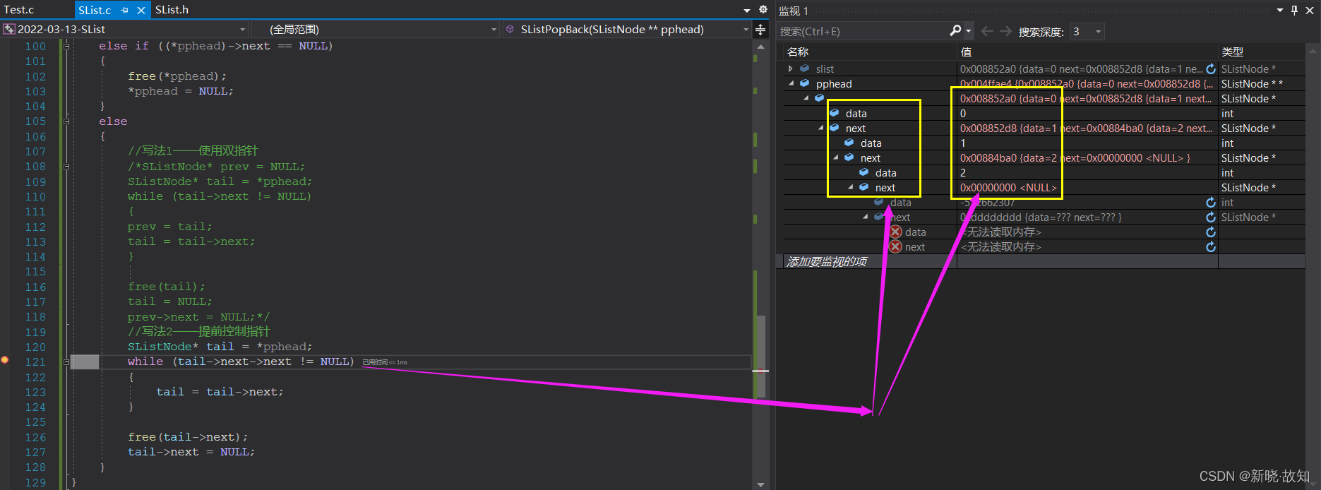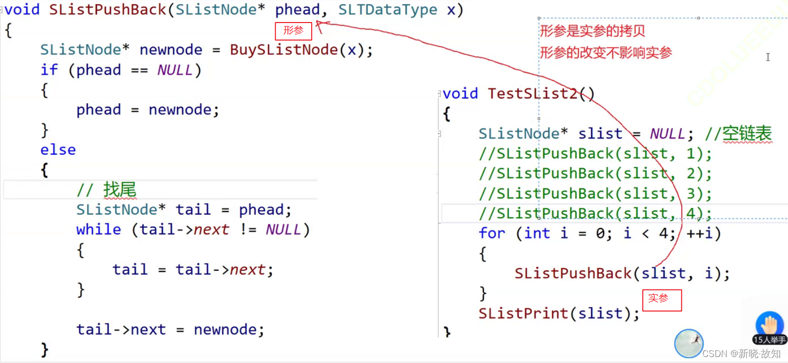 #include "SList.h" //单链表打印 void SListPrint(SListNode* phead) { //Print不需要改变什么 //assert(phead); //不需要暴力终止程序,空链表也可打印 SListNode* cur = phead; while (cur != NULL) { printf("%d->", cur->data); cur = cur->next; } printf("NULL\n"); } //单链表动态开辟新结点 SListNode* BuySListNode(SLTDataType x) { SListNode* newnode = (SListNode*)malloc(sizeof(SListNode)); //检查是否开辟成功 if (newnode == NULL) { printf("malloc fail!\n"); exit(-1); } else { newnode->data = x; newnode->next = NULL; } return newnode; } //单链表尾插数据 void SListPushBack(SListNode** pphead, SLTDataType x) { //根据需要动态开辟新结点 SListNode* newnode = BuySListNode(x); if (*pphead == NULL) { *pphead = newnode; } else { // 找尾-需要从头遍历 SListNode* tail = *pphead; while (tail->next != NULL) { tail = tail->next; } tail->next = newnode; } }