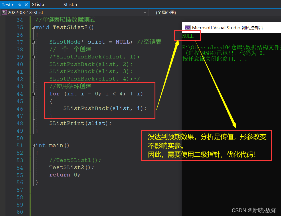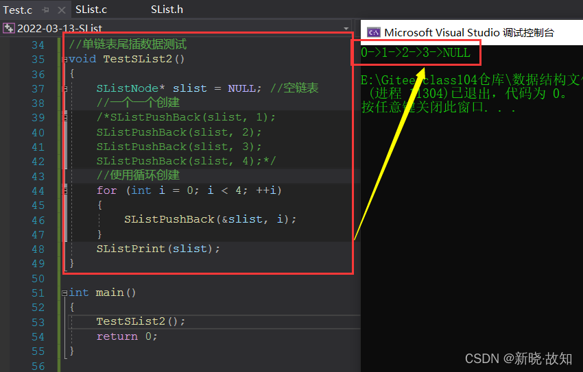 #include "SList.h" //单链表尾插数据测试 void TestSList2() { SListNode* slist = NULL; //空链表 //一个一个创建 /*SListPushBack(slist, 1); SListPushBack(slist, 2); SListPushBack(slist, 3); SListPushBack(slist, 4);*/ //使用循环创建 for (int i = 0; i < 4; ++i) { SListPushBack(&slist, i); } SListPrint(slist); } int main() { TestSList2(); return 0; }