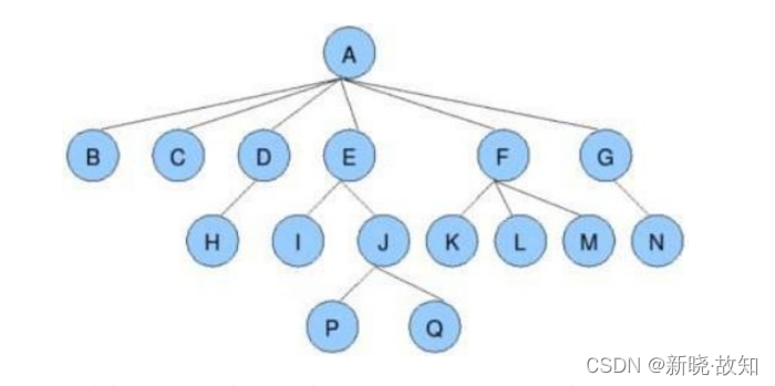 子孙:以某节点为根的子树中任一节点都称为该节点的子孙。如上图:所有节点都是A的子孙