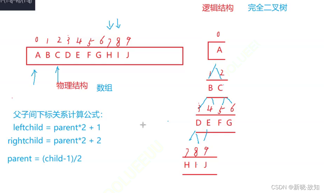 1. 若i>0,i位置节点的双亲序号:(i-1)/2;i=0,i为根节点编号,无双亲节点