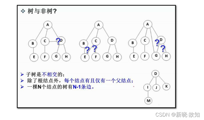 ◆除根节点外,其余结点被分成M(M>0)个互不相交的集合T1、T2、……、Tm,其中每一个集合Ti(1<= i<= m)又是一棵结构与树类似的子树。每棵子树的根结点有且只有一个前驱,可以有0个或多个后继