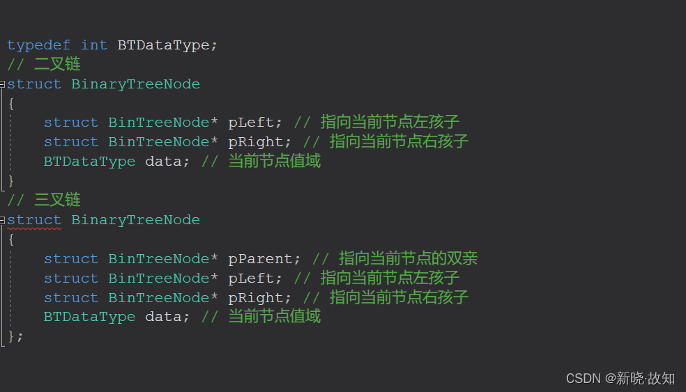 typedef int BTDataType; // 二叉链 struct BinaryTreeNode { struct BinTreeNode* pLeft; // 指向当前节点左孩子 struct BinTreeNode* pRight; // 指向当前节点右孩子 BTDataType data; // 当前节点值域 } // 三叉链 struct BinaryTreeNode { struct BinTreeNode* pParent; // 指向当前节点的双亲 struct BinTreeNode* pLeft; // 指向当前节点左孩子 struct BinTreeNode* pRight; // 指向当前节点右孩子 BTDataType data; // 当前节点值域 };