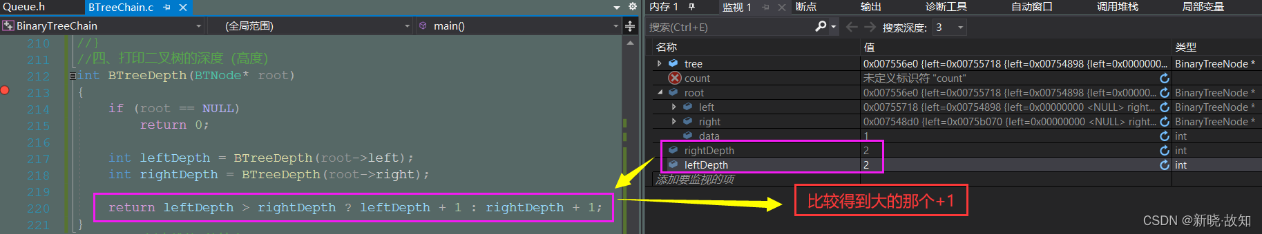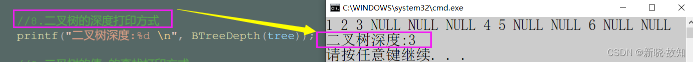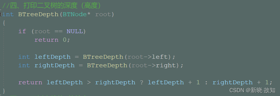 //四、打印二叉树的深度(高度) int BTreeDepth(BTNode* root) { if (root == NULL) return 0; int leftDepth = BTreeDepth(root->left); int rightDepth = BTreeDepth(root->right); return leftDepth > rightDepth ? leftDepth + 1 : rightDepth + 1; }