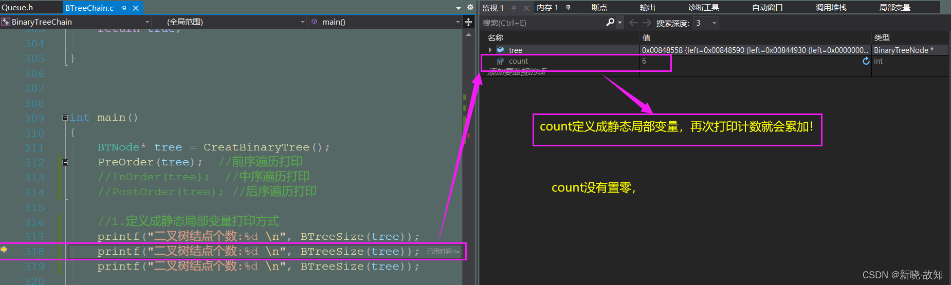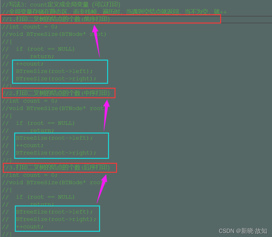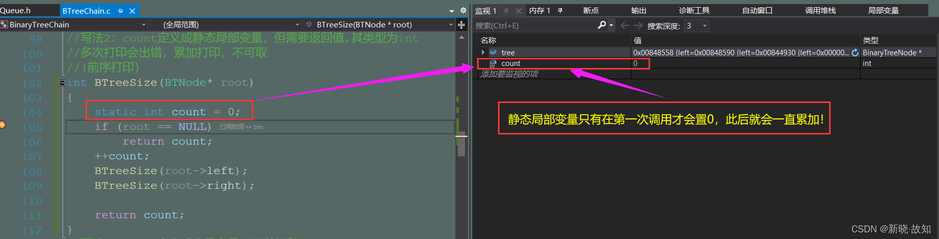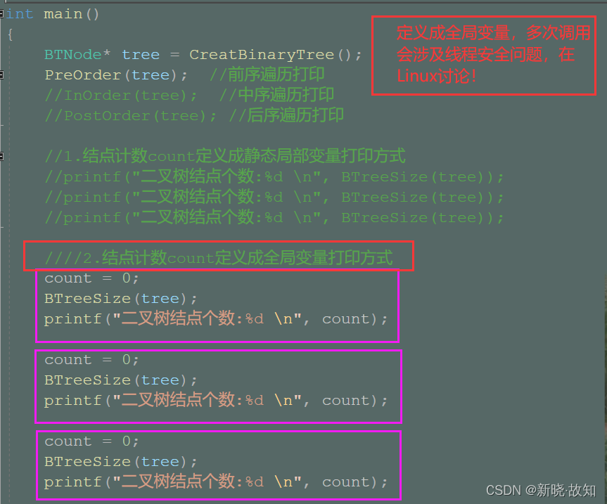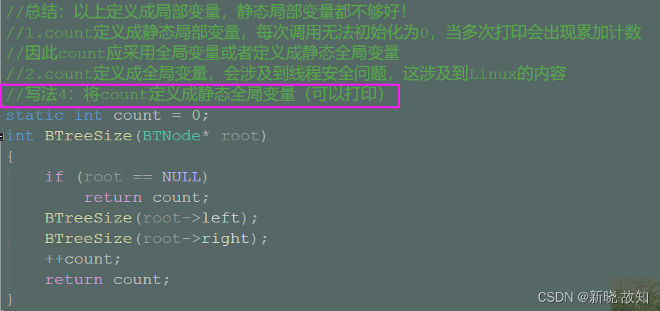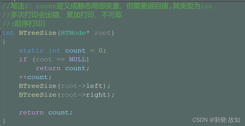 //总结:以上定义成局部变量,静态局部变量都不够好! //1.count定义成静态局部变量,每次调用无法初始化为0,当多次打印会出现累加计数 //因此count应采用全局变量或者定义成静态全局变量 //2.count定义成全局变量,会涉及到线程安全问题,这涉及到Linux的内容 //写法4:将count定义成静态全局变量(可以打印) static int count = 0; int BTreeSize(BTNode* root) { if (root == NULL) return count; BTreeSize(root->left); BTreeSize(root->right); ++count; return count; }