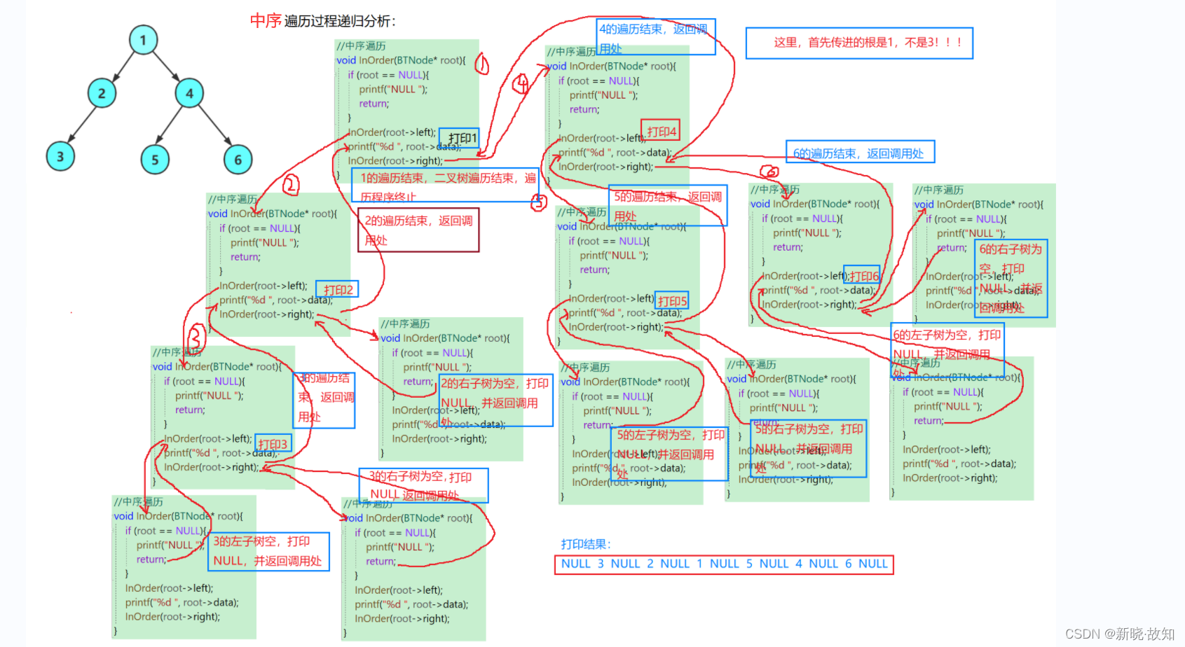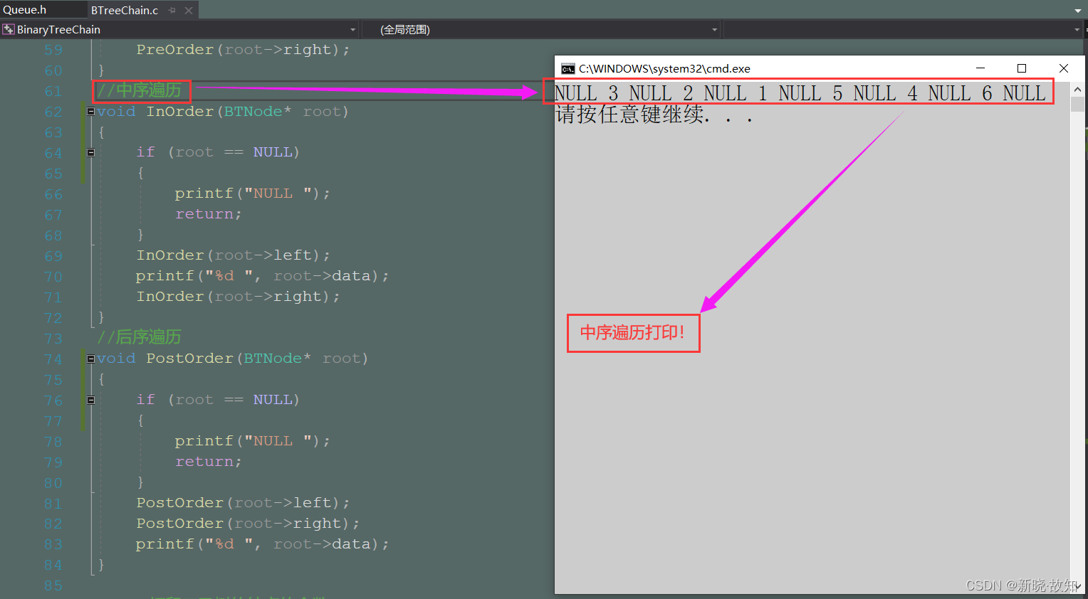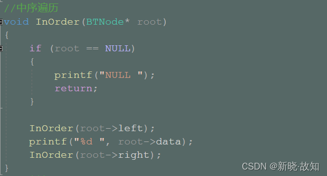 //中序遍历 void InOrder(BTNode* root) { if (root == NULL) { printf("NULL "); return; } InOrder(root->left); printf("%d ", root->data); InOrder(root->right); }