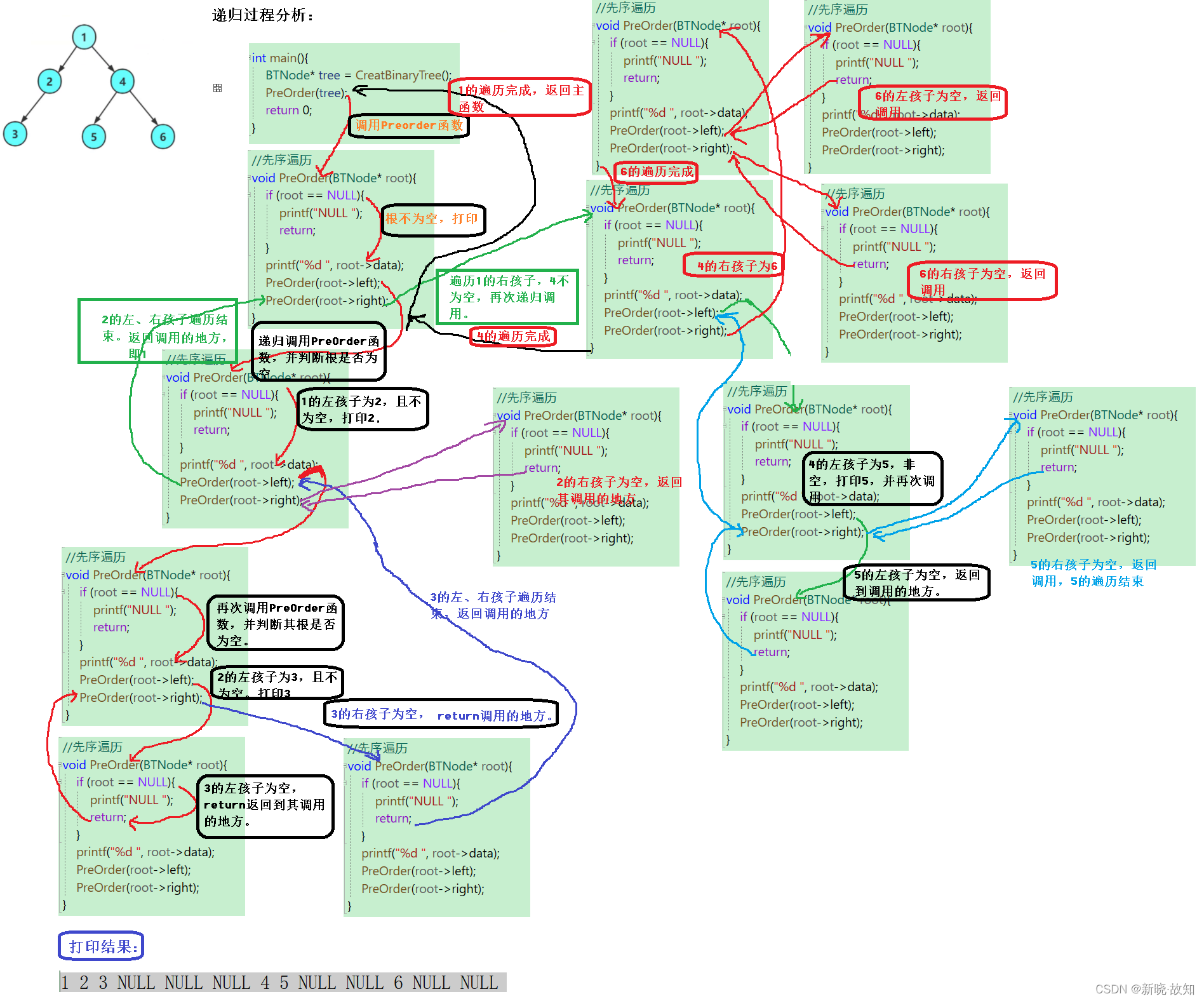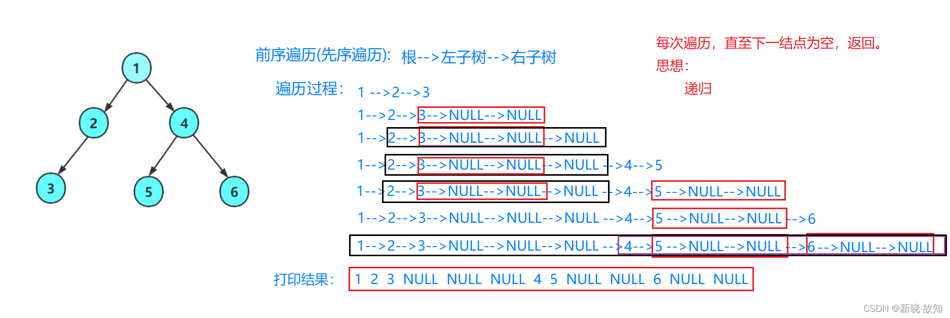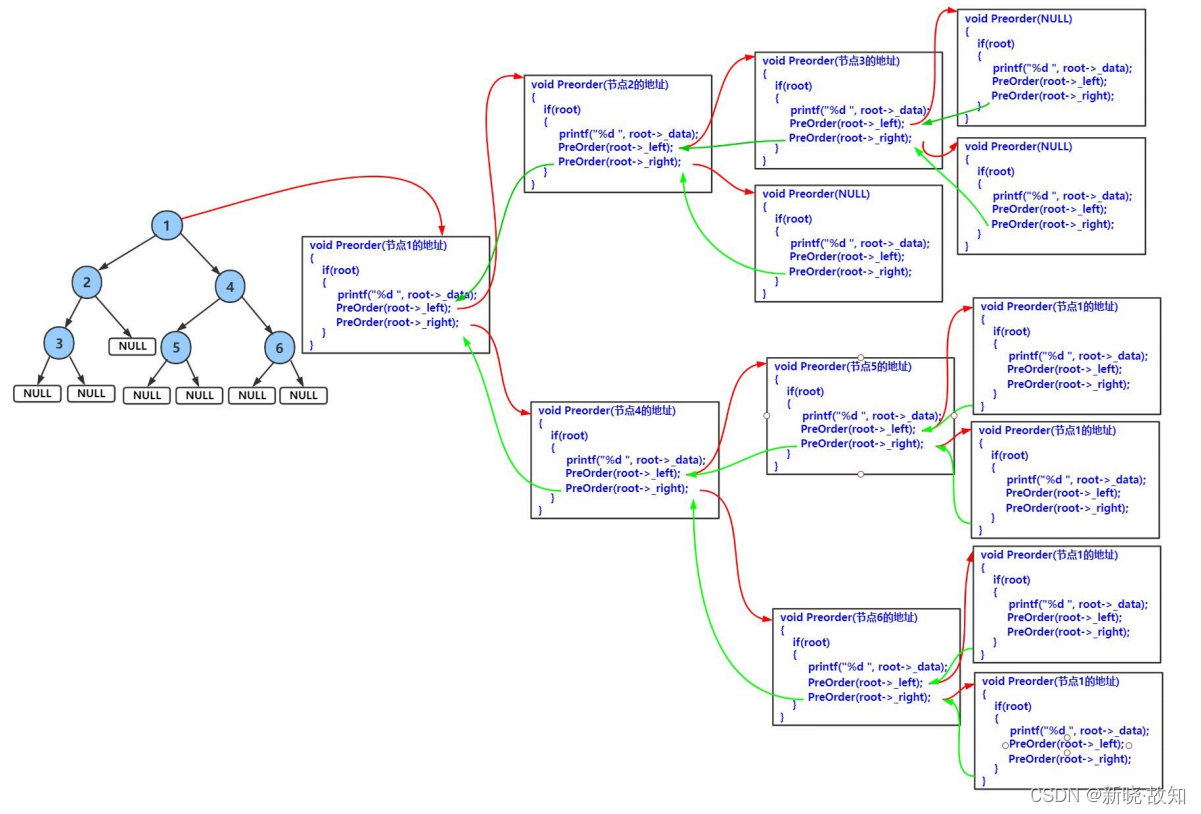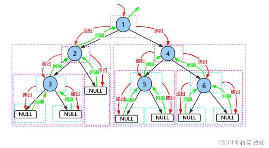 下面主要分析前序递归遍历,中序与后序图解类似。
