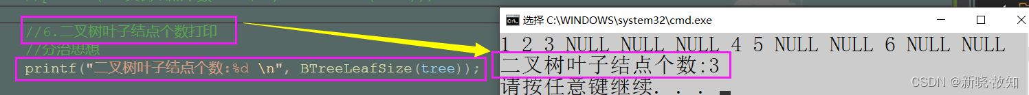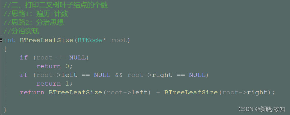 //二、打印二叉树叶子结点的个数 //思路1:遍历+计数 //思路2:分治思想 //分治实现 int BTreeLeafSize(BTNode* root) { if (root == NULL) return 0; if (root->left == NULL && root->right == NULL) return 1; return BTreeLeafSize(root->left) + BTreeLeafSize(root->right); }