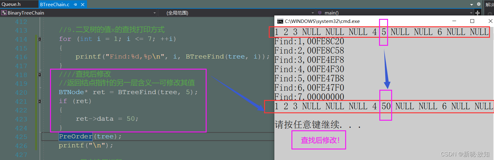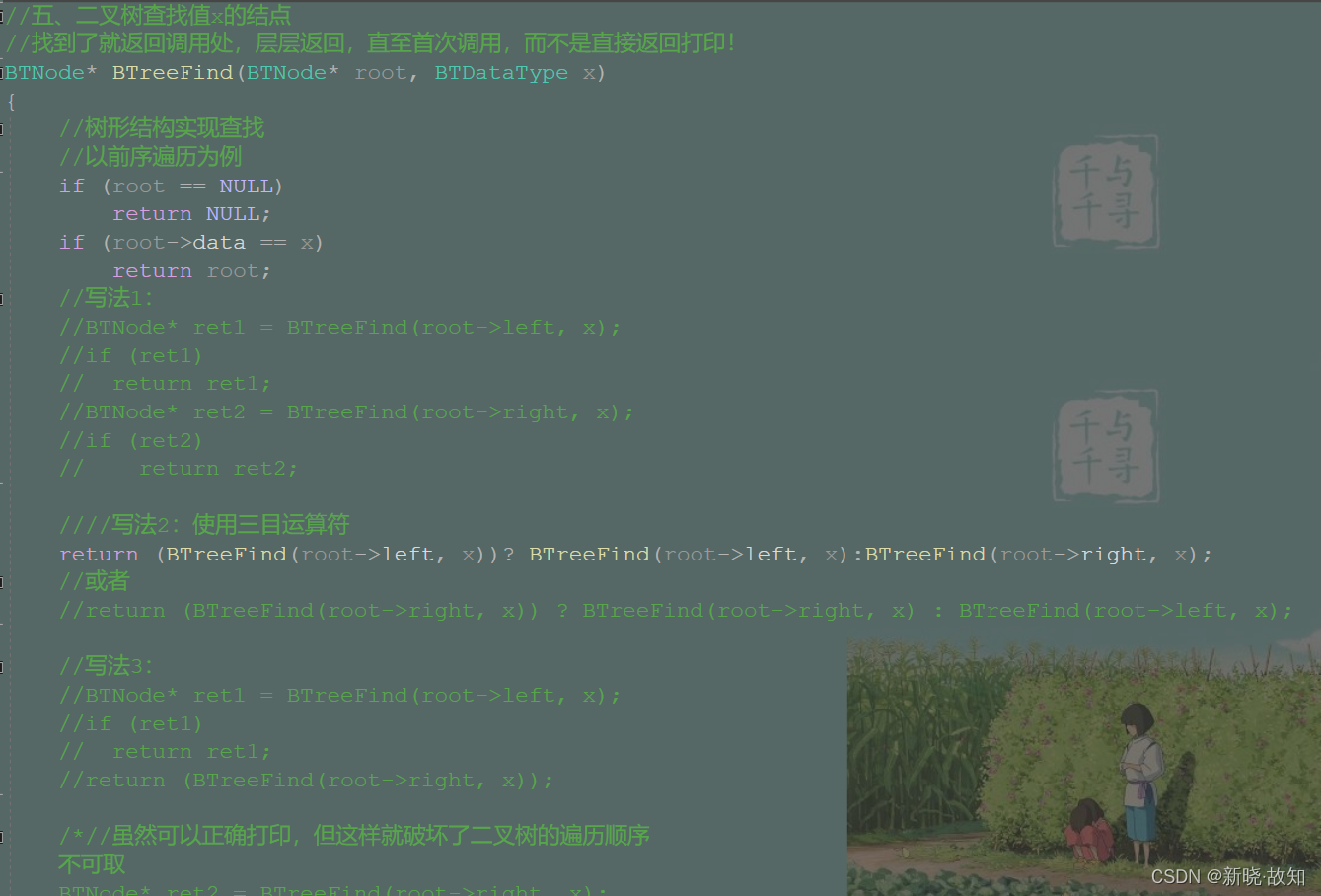 //五、二叉树查找值x的结点 //找到了就返回调用处,层层返回,直至首次调用,而不是直接返回打印! BTNode* BTreeFind(BTNode* root, BTDataType x) { //树形结构实现查找 //以前序遍历为例 if (root == NULL) return NULL; if (root->data == x) return root; //写法1: //BTNode* ret1 = BTreeFind(root->left, x); //if (ret1) // return ret1; //BTNode* ret2 = BTreeFind(root->right, x); //if (ret2) // return ret2; ////写法2:使用三目运算符 return (BTreeFind(root->left, x))? BTreeFind(root->left, x):BTreeFind(root->right, x); //或者 //return (BTreeFind(root->right, x)) ? BTreeFind(root->right, x) : BTreeFind(root->left, x); //写法3: //BTNode* ret1 = BTreeFind(root->left, x); //if (ret1) // return ret1; //return (BTreeFind(root->right, x)); /*//虽然可以正确打印,但这样就破坏了二叉树的遍历顺序 不可取 BTNode* ret2 = BTreeFind(root->right, x); if (ret2) return ret2; return (BTreeFind(root->left, x));*/ return NULL; }