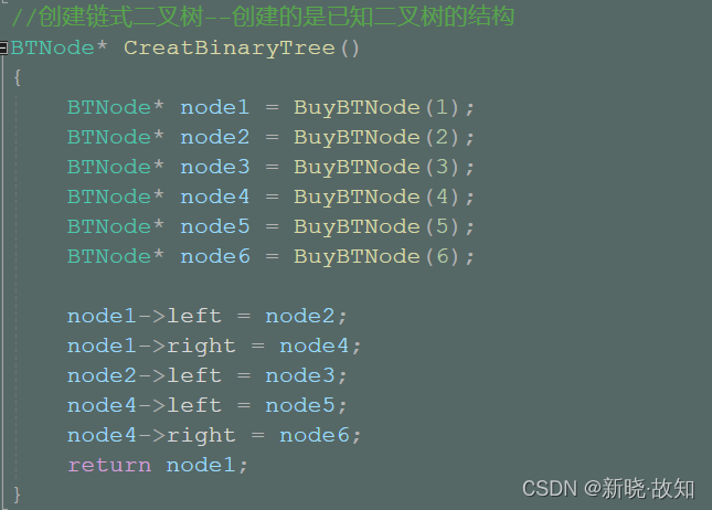 //创建链式二叉树--创建的是已知二叉树的结构 BTNode* CreatBinaryTree() { BTNode* node1 = BuyBTNode(1); BTNode* node2 = BuyBTNode(2); BTNode* node3 = BuyBTNode(3); BTNode* node4 = BuyBTNode(4); BTNode* node5 = BuyBTNode(5); BTNode* node6 = BuyBTNode(6); node1->left = node2; node1->right = node4; node2->left = node3; node4->left = node5; node4->right = node6; return node1; }