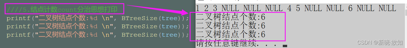 //写法6:count既不定义成局部变量,也不定义成全局变量 //分治思想 //前序计数打印为例 int BTreeSize(BTNode* root) { return root == NULL ? 0 : BTreeSize(root->left) + BTreeSize(root->right) + 1; }