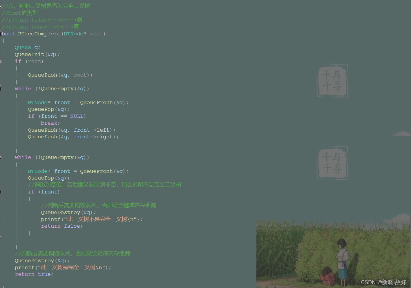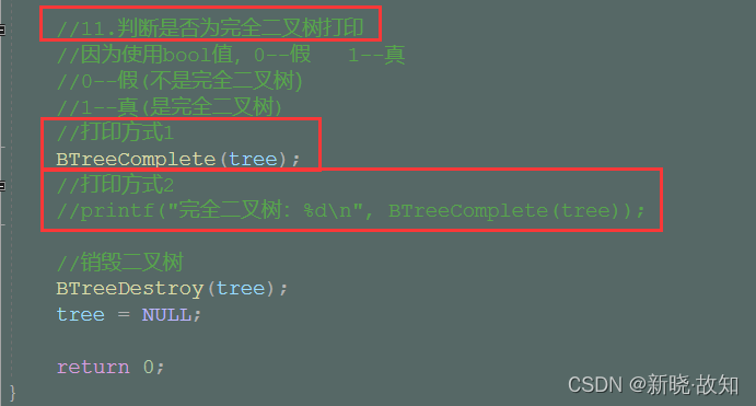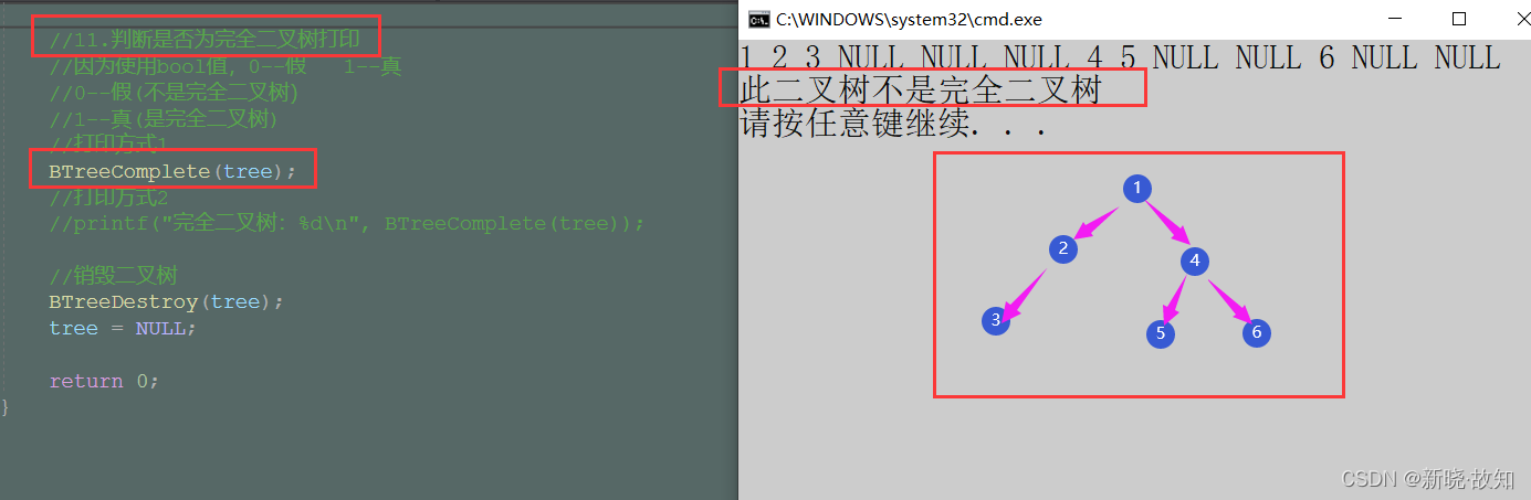 //八、判断二叉树是否为完全二叉树 //bool值类型 //return false<==>0<==>假 //return true<==>1<==>真 bool BTreeComplete(BTNode* root) { Queue q; QueueInit(&q); if (root) { QueuePush(&q, root); } while (!QueueEmpty(&q)) { BTNode* front = QueueFront(&q); QueuePop(&q); if (front == NULL) break; QueuePush(&q, front->left); QueuePush(&q, front->right); } while (!QueueEmpty(&q)) { BTNode* front = QueueFront(&q); QueuePop(&q); //遍历到空值,若后面又遍历到非空,那么说明不是完全二叉树 if (front) { //判断后需要销毁队列,否则就会造成内存泄漏 QueueDestroy(&q); printf("此二叉树不是完全二叉树\n"); return false; } } //判断后需要销毁队列,否则就会造成内存泄漏 QueueDestroy(&q); printf("此二叉树是完全二叉树\n"); return true; }