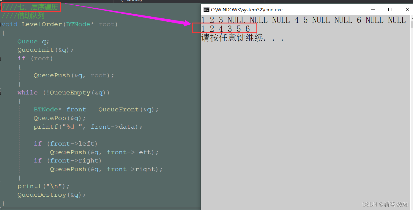 ////七、层序遍历 ////借助队列 void LevelOrder(BTNode* root) { Queue q; QueueInit(&q); if (root) { QueuePush(&q, root); } while (!QueueEmpty(&q)) { BTNode* front = QueueFront(&q); QueuePop(&q); printf("%d ", front->data); if (front->left) QueuePush(&q, front->left); if (front->right) QueuePush(&q, front->right); } printf("\n"); QueueDestroy(&q); }