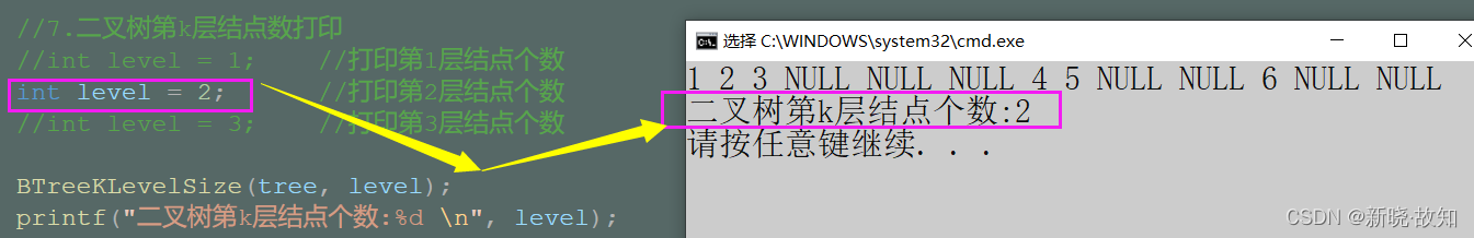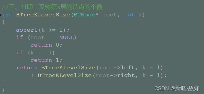//三、打印二叉树第k层的结点的个数 int BTreeKLevelSize(BTNode* root, int k) { assert(k >= 1); if (root == NULL) return 0; if (k == 1) return 1; return BTreeKLevelSize(root->left, k - 1) + BTreeKLevelSize(root->right, k - 1); }