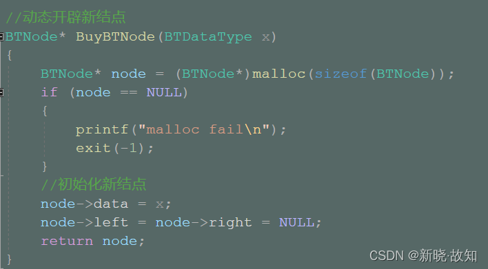 //动态开辟新结点 BTNode* BuyBTNode(BTDataType x) { BTNode* node = (BTNode*)malloc(sizeof(BTNode)); if (node == NULL) { printf("malloc fail\n"); exit(-1); } //初始化新结点 node->data = x; node->left = node->right = NULL; return node; }