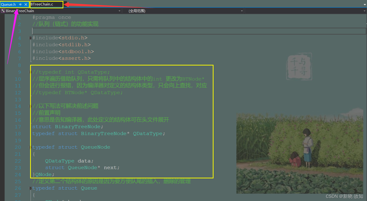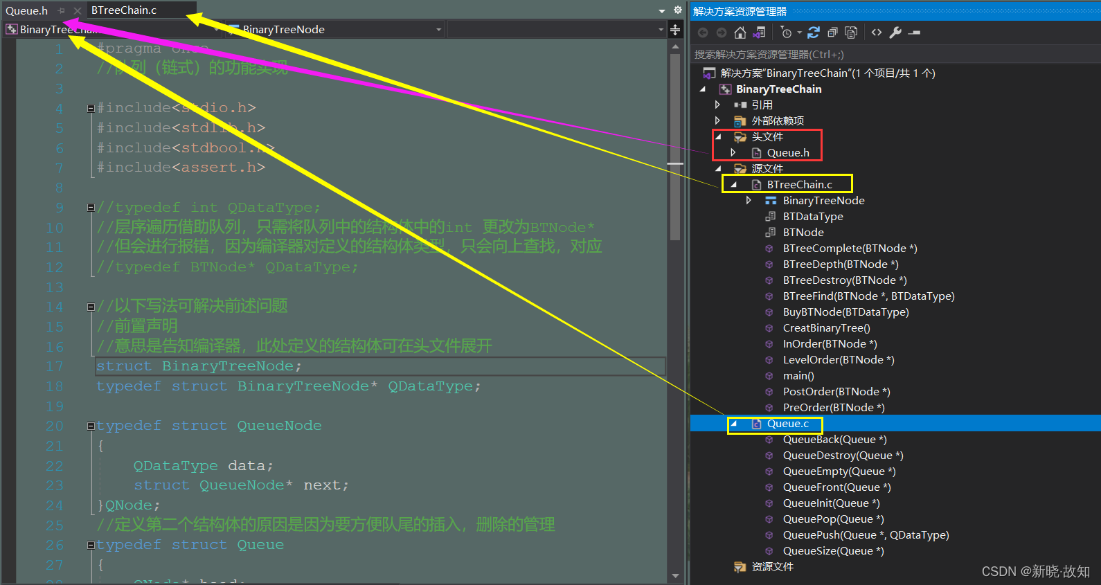 #pragma once //队列(链式)的功能实现 #include<stdio.h> #include<stdlib.h> #include<stdbool.h> #include<assert.h> //typedef int QDataType; //层序遍历借助队列,只需将队列中的结构体中的int 更改为BTNode* //但会进行报错,因为编译器对定义的结构体类型,只会向上查找,对应 //typedef BTNode* QDataType; //以下写法可解决前述问题 //前置声明 //意思是告知编译器,此处定义的结构体可在头文件展开 struct BinaryTreeNode; typedef struct BinaryTreeNode* QDataType; typedef struct QueueNode { QDataType data; struct QueueNode* next; }QNode; //定义第二个结构体的原因是因为要方便队尾的插入,删除的管理 typedef struct Queue { QNode* head; QNode* tail; //size_t size; //若经常使用,可在此增加一个计数 }Queue; //初始化队列 void QueueInit(Queue* pq); //销毁 void QueueDestroy(Queue* pq); //插入(进队) void QueuePush(Queue* pq, QDataType x); //删除(出队) void QueuePop(Queue* pq); //判断队列是否为空 bool QueueEmpty(Queue* pq); //队列大小 size_t QueueSize(Queue* pq); //size_t即unsigned int,包含在头文件 //队头 QDataType QueueFront(Queue* pq); //队尾 QDataType QueueBack(Queue* pq);