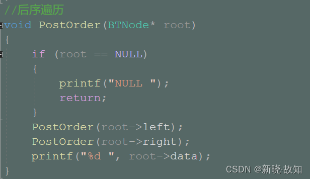 //后序遍历 void PostOrder(BTNode* root) { if (root == NULL) { printf("NULL "); return; } PostOrder(root->left); PostOrder(root->right); printf("%d ", root->data); }